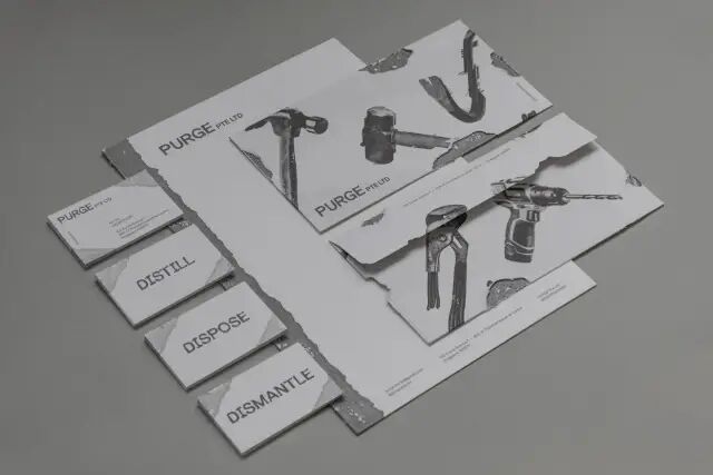 作品說明 Description:PURGE 是一间来自新加坡的承包拆屋者。名称使用的灵感来自于公司本身的性质,意思是清除空间内不必要或多余的部分,达到净化的效果。公司提供的服务包括拆除物品,空间维护,移动物品,以及清除杂物。由于工作过程会变的凌乱不堪,过于粗燥,这些想法启发了企業識別的概念。以日式侘寂的不完美美感作为主题,墙壁倒塌的描绘创造了一系列的平面观点。从公司的商标到文具和招牌,都有了同体的‘敲打’过的痕迹,立体的显示了公司对于自己要求的专业水平。这个效果让客户感到非常满意,而为了实现一致的艺术方向感,敲打的痕迹被运用在整体的字目上,打造了一副量身定做,独一无二的排版。每一件公司的文具都是亲手刻痕的,达到了一种精美与特殊的效果。例如,信封上找得到被拆撕过的痕迹,来显示地下部分的内容。文具使用的纸张类型也是精心挑选过,然后运用了胶印技术,彻底实现了公司提供的专业水平。PURGE — 敲能成事的巧妙。