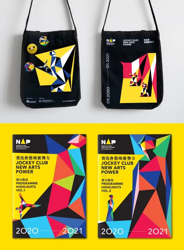 一:「多樣性」和二:「榮譽」。 一:「多樣性」。它意味著這個藝術節具有多種藝術形式。通過本次活動,公眾有機會接觸到不同色彩的藝術。幾何圖形取自現有的 NAP 徽標(A型狀代表聚光燈)並進一步延申和闡述:從一個(三角型聚光燈)建構成幾個立體空間場景(外面立體化的棱型)二:「榮譽」。看似隨機的幾何圖形匯聚在一起,建構了「立體主義」藝術形式的畫面,藝術家們的表演就好像是在這立體主義空間裡的作品。亦是聚光燈下的藝術新星,同時,這提案把新藝術家視為當今社會中的創造者角色。實用性方面,幾何插圖很靈活且易於應用於不同的宣傳物料,形成具整體性的視覺識別。