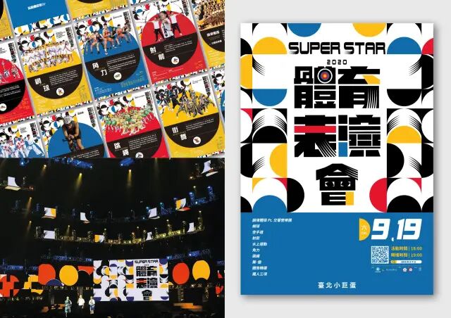 作品說明 Description:2020 SUPER STAR體育表演會是臺灣體壇的年度盛事,由臺灣教育部體育署主辦於台北小巨蛋,以推廣臺灣各項運動賽事、體能教育及全民運動為主軸,25組優秀體育團隊、10 項(鐵人三項、射箭、空手道、韻律體操、民俗體育、網球、水上運動、角力等)精彩絕倫的跨界運動表演,超過30,000名熱血沸騰的現場觀眾,一同見證臺灣最具規模的體育表演殿堂。海報意象連結針對年度體育表演會的演出項目特色,每一幕都精彩、每一瞬間皆為得勝關鍵,將文字以動態感的方式與殘影的表現效果呈現,無論是角力、空手道甚或是網球等都是讓人無法閉眼、令人屏息的豐富演出。將文字搭配豐富色彩與球類項目、動態影像的幾何造型,並發展為應用圖紋與運動項目圖標的視覺設計系統。以射箭標靶的主色調紅黃藍三大色系,應用於文字結構色彩,展現活潑有朝氣之色彩計畫,期許每位熱愛運動的參與者,永遠記得那鮮明、單純的喜悅與實踐目標的快樂,同時也透過自身體育專長產生正面影響力,在臺灣體壇的年度盛事體育表演會上這樣一個指標性的平台上,展現多采多姿的自我並鼓舞更多廣大社會民眾。