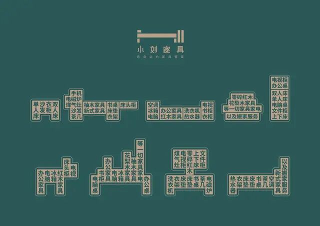作品說明 Description:上海小刘新旧家具调剂店企业形象设计,通过经营范围的文字拆分重组,组合出不同的家具样式,对品牌的阐述更加直接。