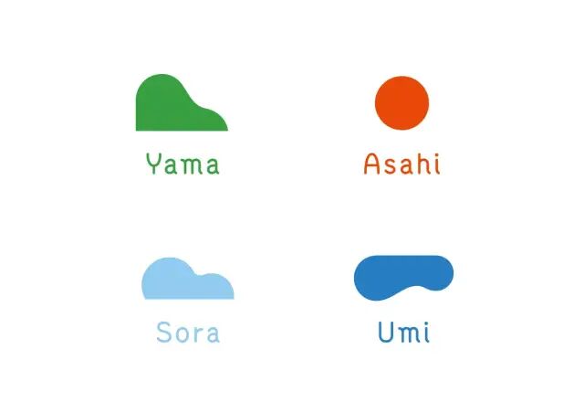 The roof shape is common to all houses, while the characteristics of each house are presented in the logo. Tsukihi House: with the moonlight shining upon, Yuhi House: with the evening sun shining upon,Asahi House: with the view of the beautiful morning sun,Noboru House: with multiple levels,Ieno House: with roof inside the house, Meguru House: with corridor inside the house