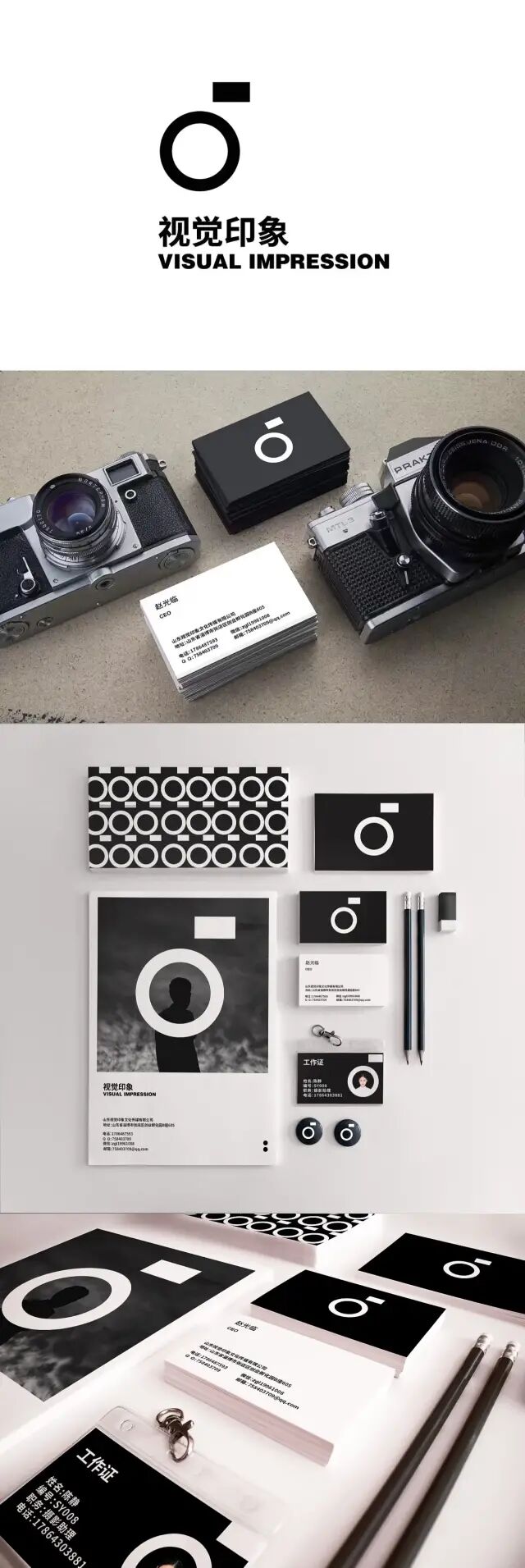 作品說明 Description:視覺印象攝影公司作為一家從事視頻拍攝、商業攝影的公司,近年來一直保持上升勢頭。每年大學生畢業季時期拍攝畢業照是他們讓人印象最深刻的時候。在入手設計時,我們想讓設計符合當代大學生的審美需求以及體現校園文化積澱。同時也給人商業設計的信賴感。同時通過簡潔清晰的視覺排版以及標誌的組合出現形成視覺邏輯與秩序。如何體現一個相機的“靈魂”呢?我覺得那就是相機的鏡頭(圓環)和快門(方形)吧。