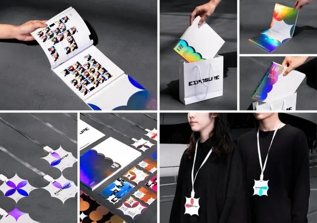 作品說明 Description:「曝光之下,我們都將成為畫面中最耀眼的存在。」「曝裡有光,光裡有彩,彩裡有我們」——以向四角突出的圖形作為基礎符碼,代表各個單一的組別,再進而將符碼含義與圖像作延伸變 化,結合成包括本次展覽四大類別(平面、多媒體、插畫、包裝)的新符碼,而當所有符碼組合,色光匯集,主視覺「曝」便將乍現光彩。「曝」由色譜上各自獨立運行的粒子,也就是全體參展人,所結合而成。而這份耀眼,則有賴觀者的參與,才能夠盡情綻放異彩。因此, 在紙材選用上,鐳射紙依據觀看角度的不同即呈現色彩各異的特性,恰巧與本次展覽欲傳達之概念與期盼緊緊媒合——無論參展人、觀看者,與本次展覽,都是獨一無二、璀璨奪目的存在。