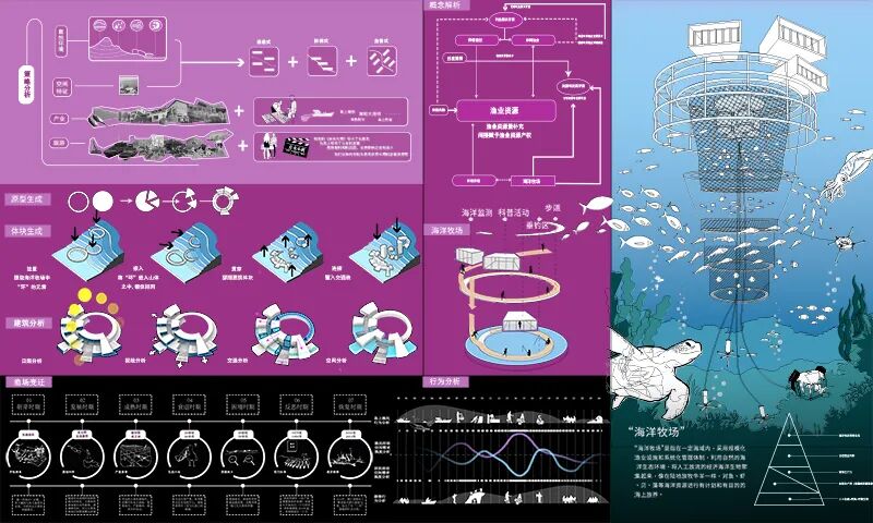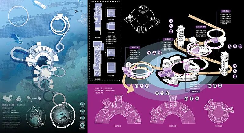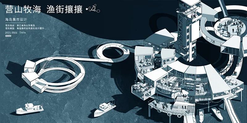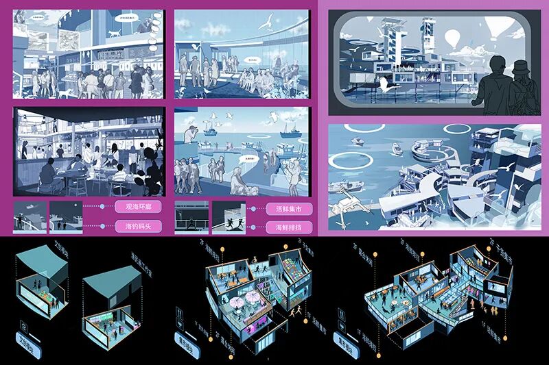 创作说明:本设计选址于浙江省舟山市,该地区为实现可持续发展将传统渔业逐渐转型发展旅游业。实地调研后,我们提出结合码头集市与海洋牧场,并利用当地渔村文化设计出一个功能复合的海岛集市,为游客提供多层次的渔文化体验。