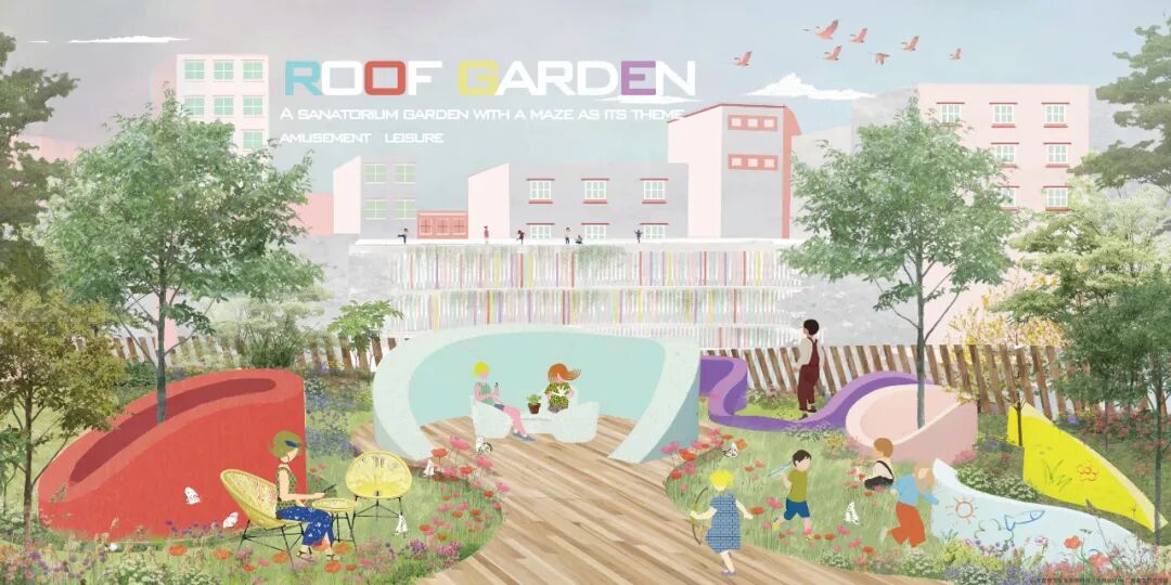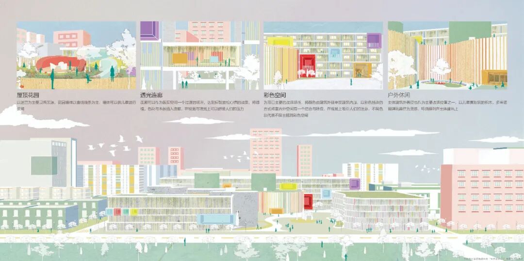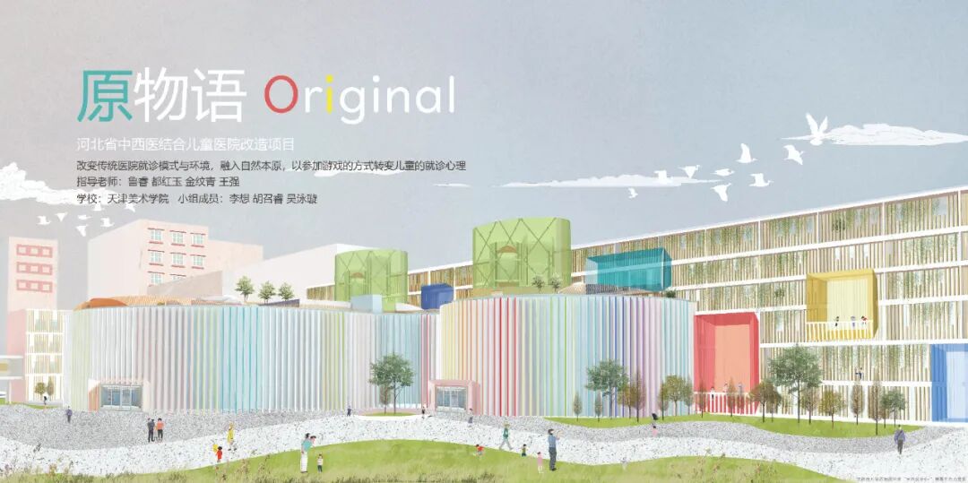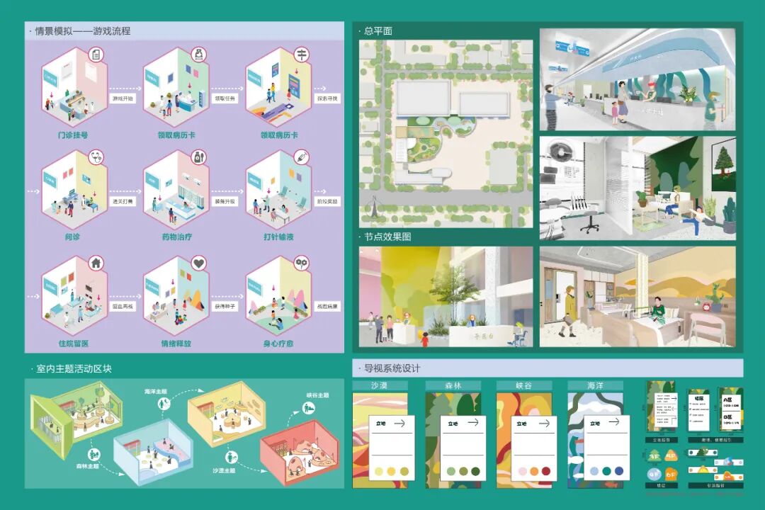 创作说明:本项目旨在改变传统医院的就诊模式与环境。在就诊模式上,以参与游戏的方式转变儿童的就诊心理。在建筑、室内和景观三方面的改造上,一是置入彩色功能小块;二是提取自然元素,以四个自然主题来设计院内导视系统和室外疗愈空间。