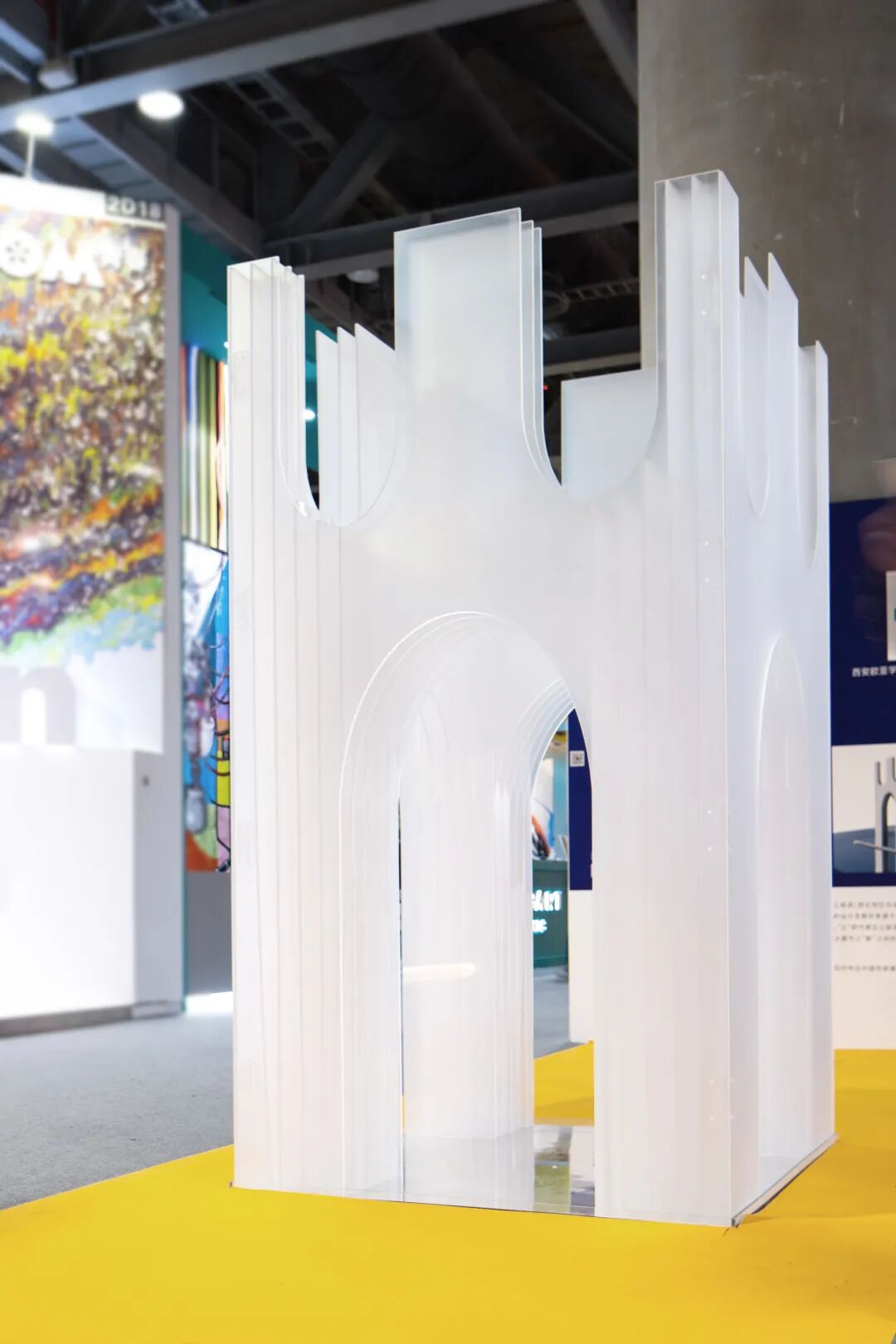 “首先古,西安是一个十三朝的古都,它代表了这样一种拱守护的形态,面对西安这个国际化大都市,它其实也面临着一种重构与新生。这是我们设计在前期的推演,就是将这样一个二维、三维以及堡寨,堡垒式的形态进行推敲,形成我们此次装置设计的方案,用磨砂亚克力加上镜面不锈钢,同时,我们希望利用流动性的灯光使体量更大一点,但遗憾光源的部分没能够实现,我们根据这个在工厂加工了以后,全部进行切割,在工厂里面进行一体的搭建成型。”