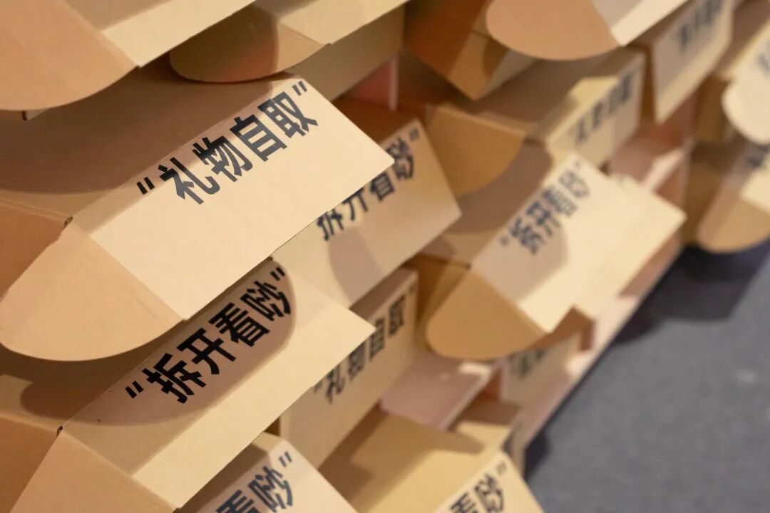 “城市就犹如庞大的巨物,唯有你我,窗口闪烁,这些窗口就是我们这次装置的一个思路来源,我们的思路有一个个小格子,首先是限定的空间,有一个个窗口,每个窗口是一个家庭一个故事,我们在里面填充的每一个小巷子里面是一份来自武汉不同的人的一份小小的心意。最后呈现出来的是这样一个状态,后面是一个很简单的货架,中间每一个盒子就是我们的朋友或者参与这个活动的个体,不同行业、各种各样的人们,他们觉得很有趣,可以把一份善意带到广州来。最后是以开盲盒的形式,人手一份,在现场参展的设计师、参观的设计师可以去打开领取一份属于自己的礼物。