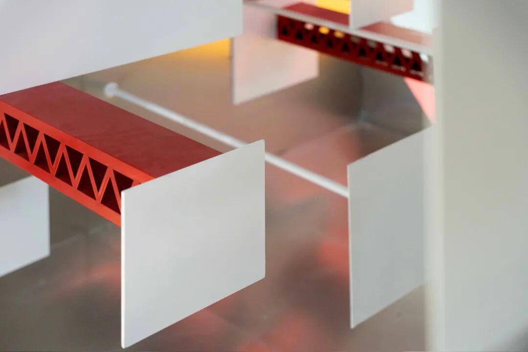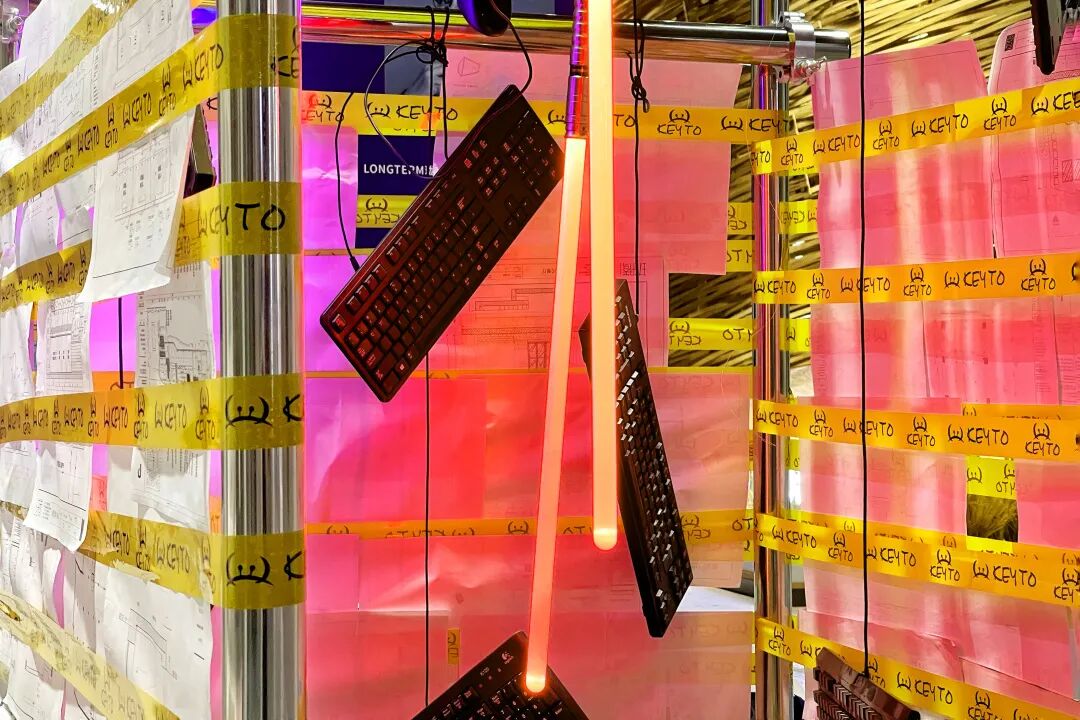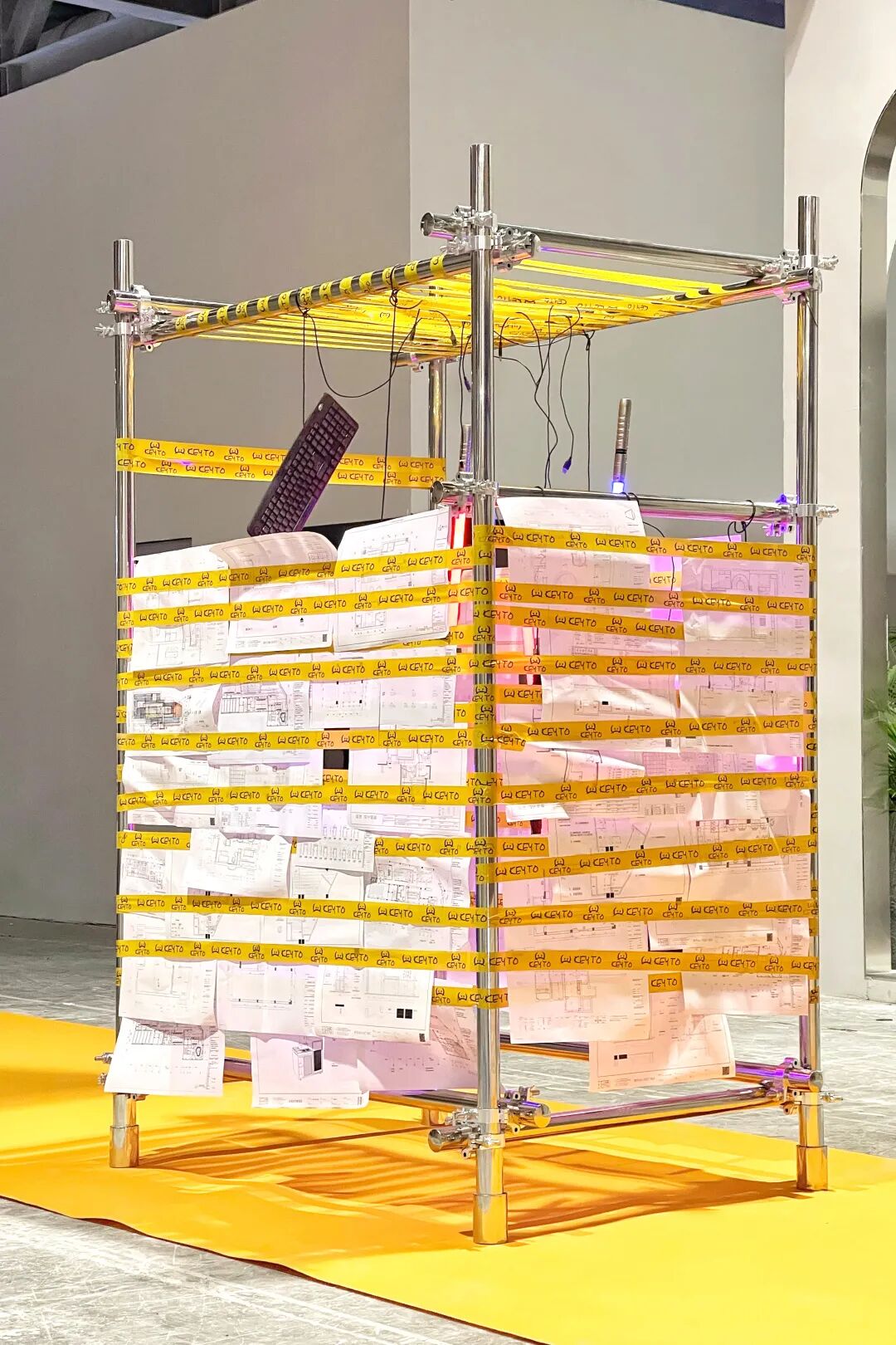 “还有另外一点是基于环保,做装置,有搭建成本、使用成本,包括其他等等的成本,在这个过程中,我想是不是可以利用我们身边的材料,来减少损耗。所以我们找了一些温州的各个年龄层次的设计师的一些废弃图纸,里面有手稿,有工装、有家装,把这些图纸根据我们定制的胶带,包括钢管架做了一个组合,组建起来。