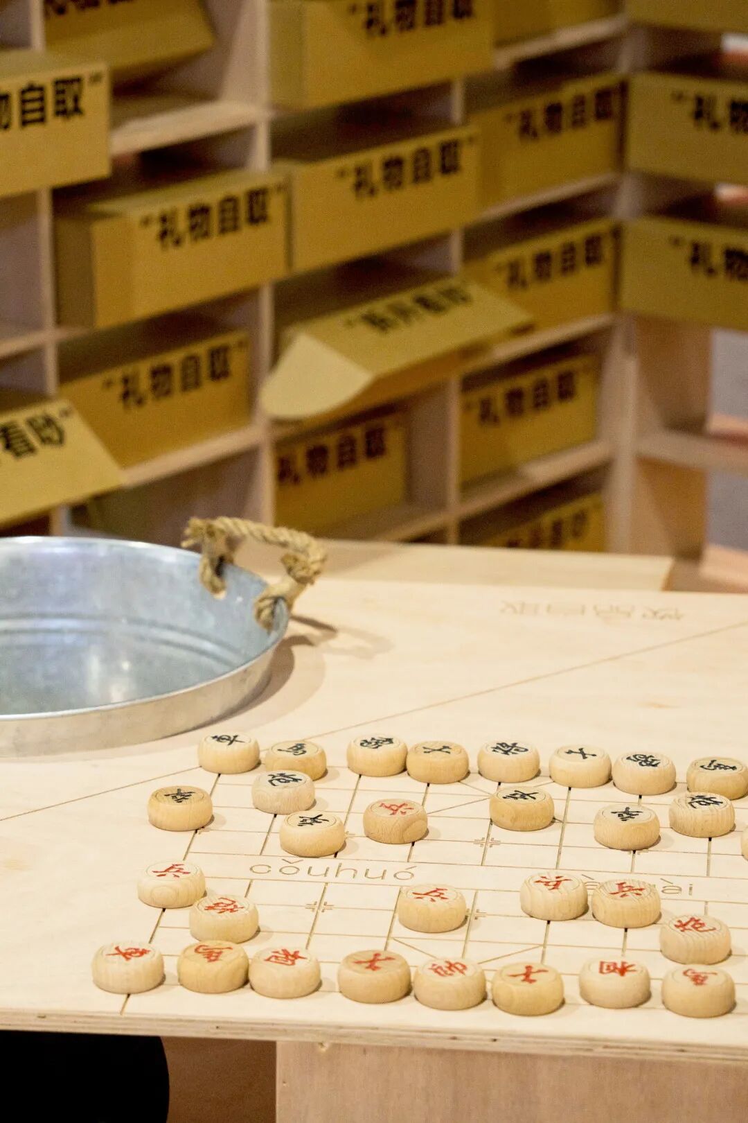 前面有一个小桌子,小桌子上面我们刻了一个象棋的棋盘,可以坐下来休息会儿,也可以下下象棋,稍微有点娱乐性。这个圆形的地方是一个啤酒桶,我们在里面放了很多啤酒,里面的酒是武汉本土的品牌做的一些精酿啤酒,它类比右边这张图,是武汉一个很老的巷子,它很能代表老武汉的一种市井生活方式,人们坐在外面聊聊天、下下棋、喝喝酒,旁边就是一个杂货店,里面有各种各样的物品,是一种生活方式的小的转换。”