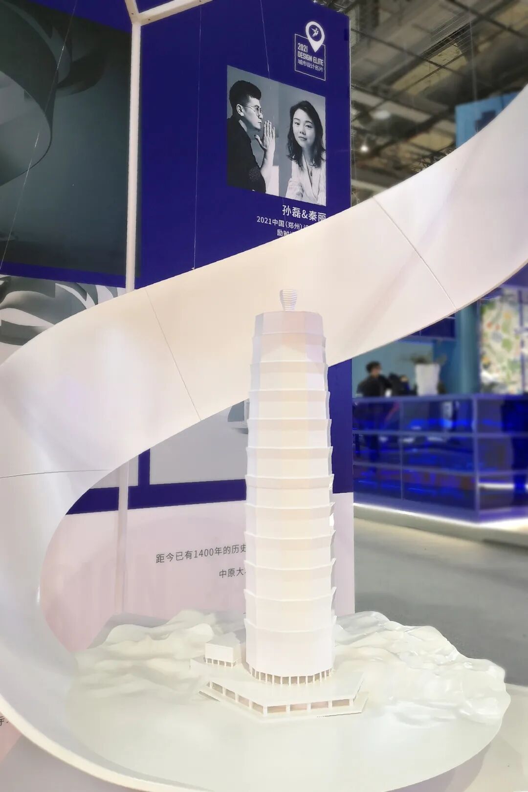 “于是我们就制作了这样一个装置,雕塑中央矗立的千玺广场,我们称之为【大玉米】,这栋建筑的设计理念也是取自郑州嵩山距今1400多年历史的嵩岳寺塔,也是郑州的地标性建筑;基座部分波涛汹涌的造型象征洪水和疫情;由基座向上盘旋的飘带寓意为我们不断上升的意志力和坚韧的信念。