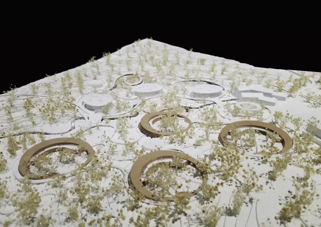 熊猫新舍作为大熊猫的养护中心,致力于促进跨学科的合作。新舍的设计围绕四个适于观察及参观的圆形露天庭院进行组织布局,庭院主要用作大熊猫的户外活动场所,创造其与自然的密切联系。建筑以环抱自然的方式围合了室外活动场地,随着地势的高低起伏和水系的蜿蜒变化,为熊猫和访客提供了丰富的自然场景体验。