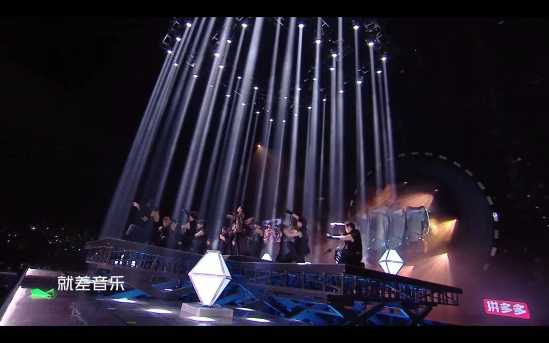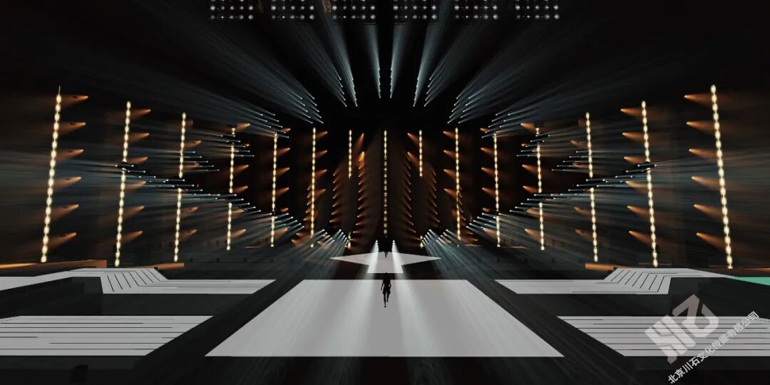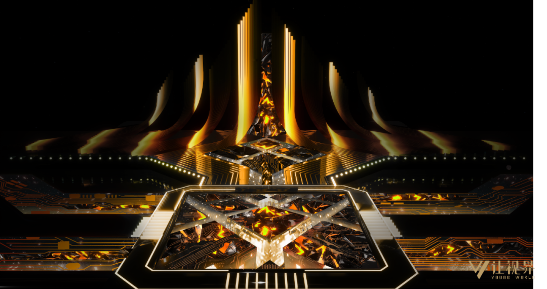 主舞台周围是整体向上的舞美结构,灯光镶嵌在舞美景片中,整体结构呈向心式构图,以此为中心向外发射高频能量,营造无限未来的空间延伸感和纵深感,极大提高视觉张力。
