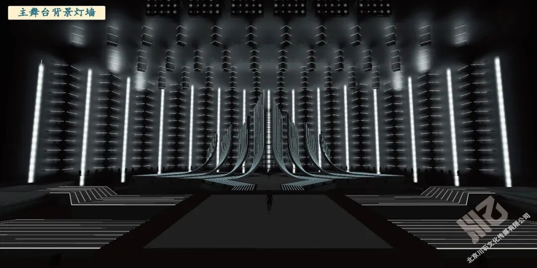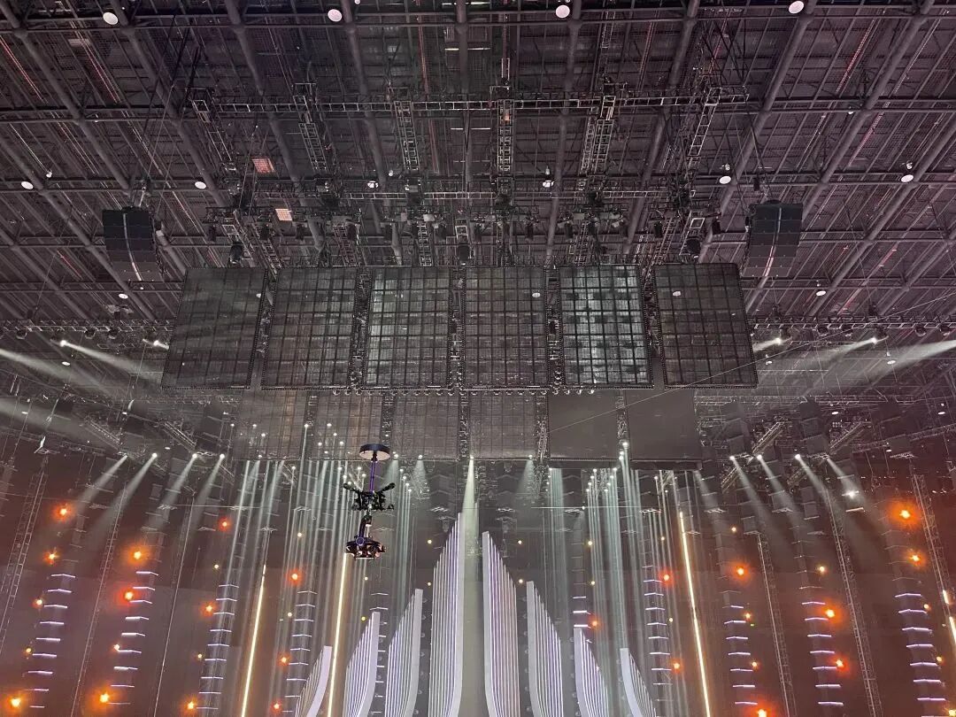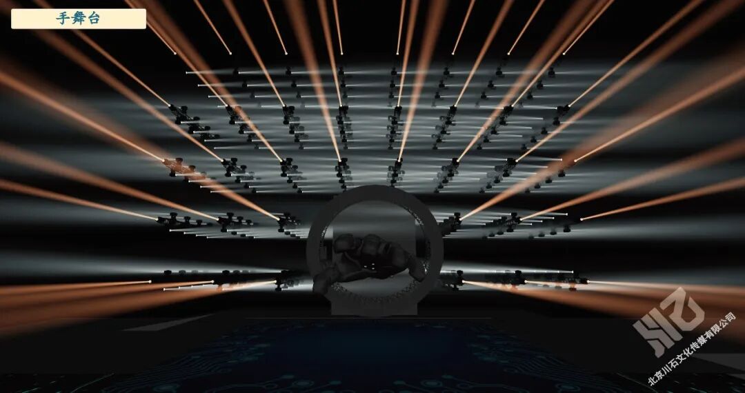中心芯片舞台为主要表演区域,向四周驱动发散,上方有足够的空间体量,22条数控升降梁,灯光可以在舞台上空做更多动态变化。芯片舞台上空12组动态飞屏灯光装置和升降灯架成矩阵式组合就很好平衡了整个舞台空间,营造了多元化的立体感,为舞台表演提供了更多意想不到的可能性。
