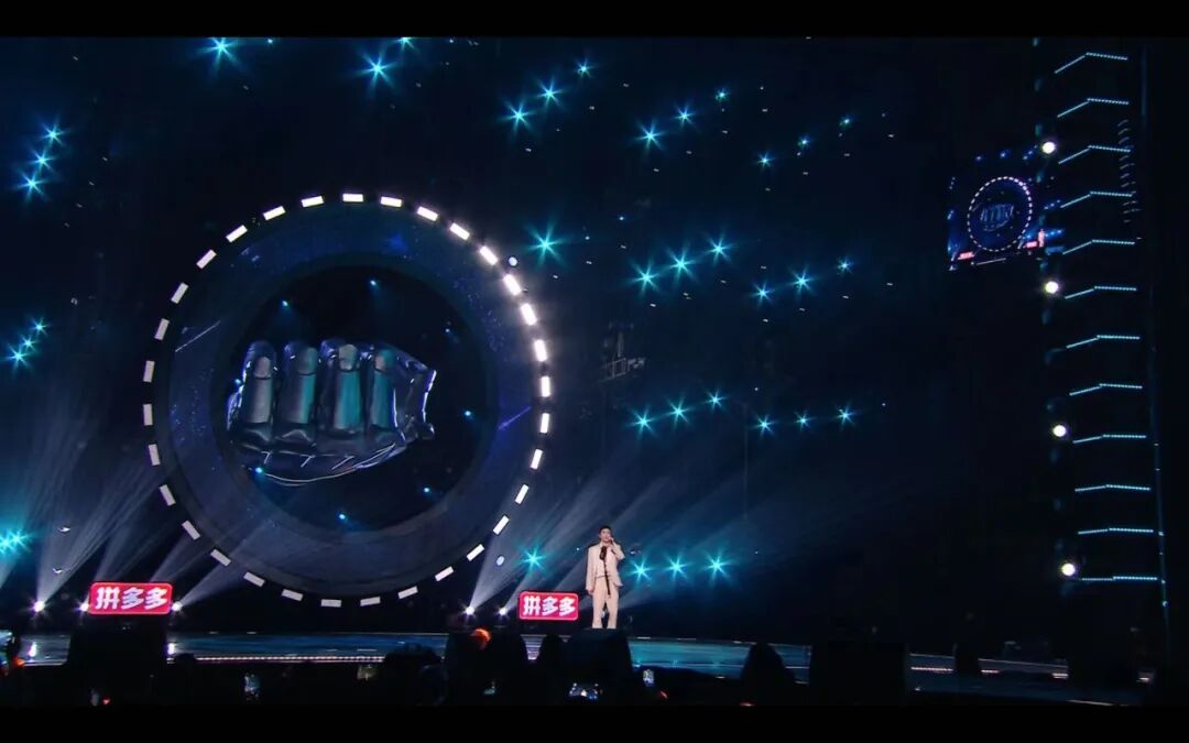 视觉上用灯光搭配纯AR虚拟视觉打造无限空间,舞台上空打破空间的束缚,两只手慢慢靠近,飞屏前倾旋转排成竖向阵列,碎成无数碎片。三个金色巨大的经典中国“英雄”形象用3D建模呈现出来,C位中“斗战圣佛”孙悟空的面部表情更是展现出英勇无畏的气势,随着音乐进入高潮阶段,碎片向中心汇聚,能量波成圆圈向外扩散,最后汇聚到中心,表达歌曲的力量感。