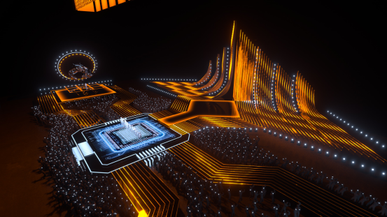 芯片是实现中国式现代化最重要的科技生产力,芯片如第一、二次工业革命中的蒸汽机、内燃机,其决定着新时代生产力。舞美通过中心舞台的超级芯片驱动发散到各个空间,同时也驱动着主背景的那团火焰。