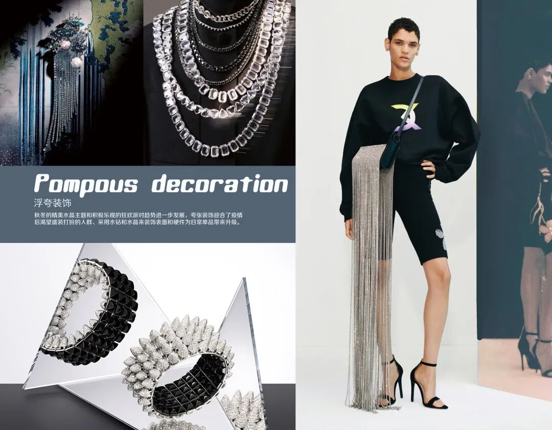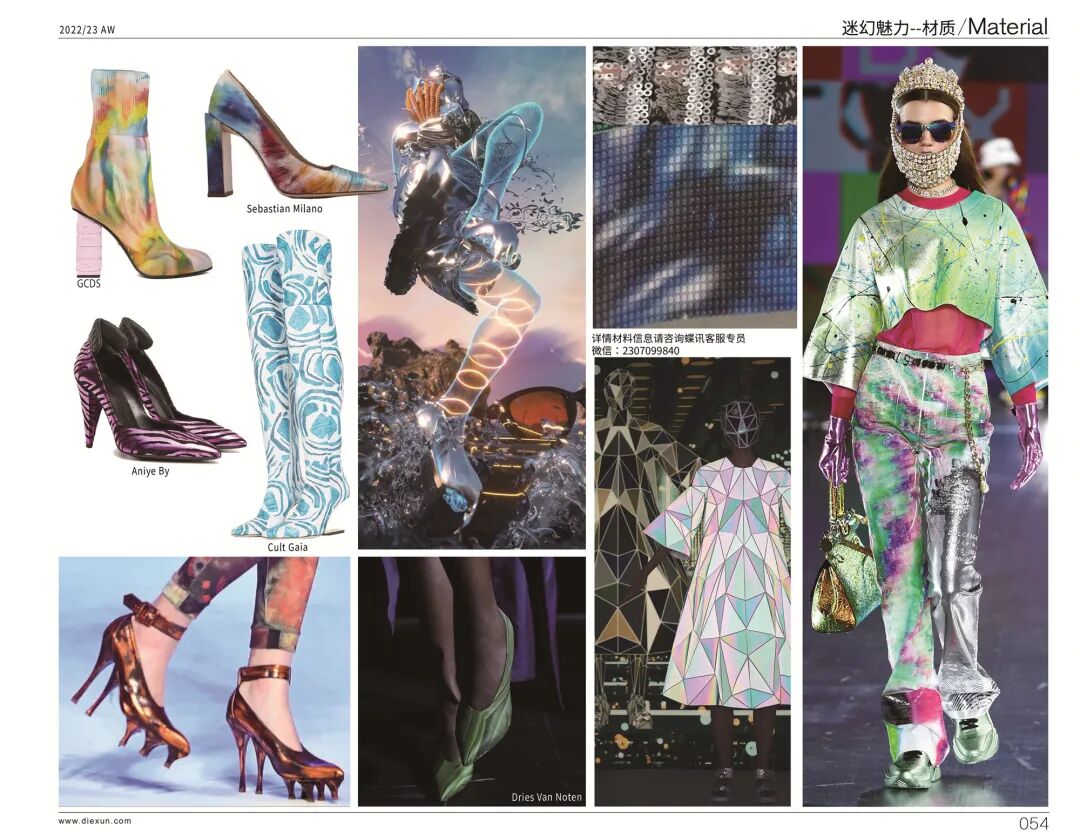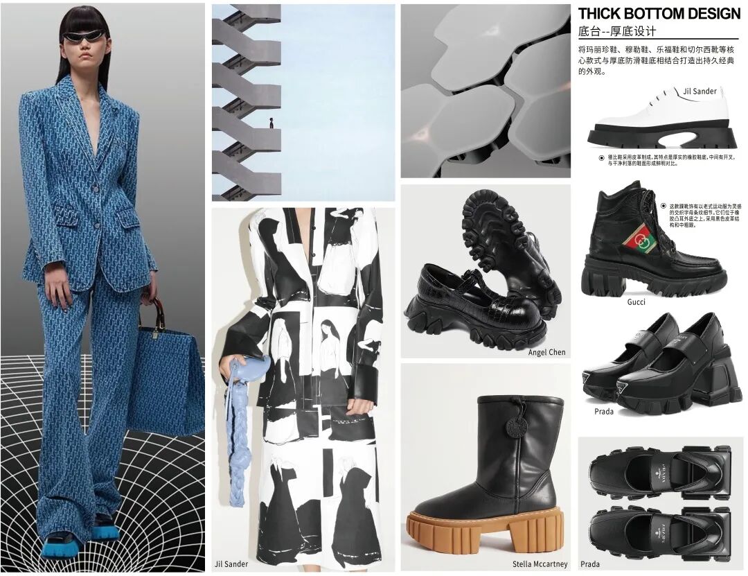 2022/23秋冬女鞋趋势分析以“元宇宙”为主题,在色彩方面受元宇宙概念的影响,打造出数字化魅力的秋冬色盘,有真实自然的浓郁植物基色调,也有兴奋感与数字化超脱感的色彩。 受T台的影响,本季材质和细节方面被赋予多样化,超软奶油皮、丹宁、卷毛羊羔绒、激光切割皮革、浮夸装饰、物质数字化情绪摇滚装饰等细节展现未来科技的生活理念以及工艺感。