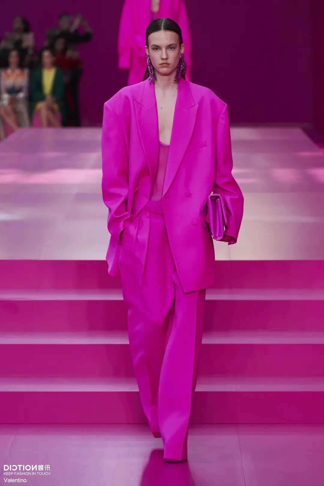 玫瑰紫在本季时装周中大放异彩,Valentino甚至选择了它作为整场大秀中的唯一有彩色相,这冒险的决策赢来了众多媒体的正向评价,与其选择了这种具有时尚基因的玫瑰紫不无关联。