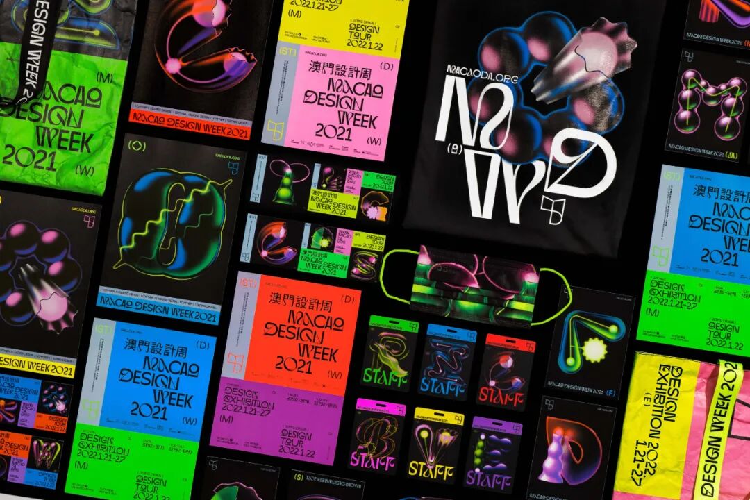 2021澳门设计周主视觉,由 Indego 工作室操刀,设计灵感来源于澳门的“”,因此黑色成了本届设计周的基调,三张主视觉海报分别是澳门设计周的英文开头字母“M”“D”“W”,富有个性的造型和略带神秘的质感,黑色背景下的彩色字体,就像黑夜街头五光十色的霓虹灯,象征着澳门设计界不断绽放的光芒与能量。