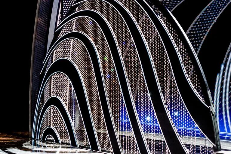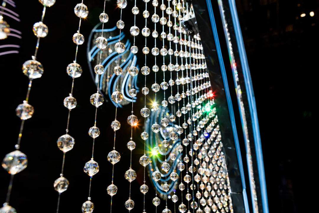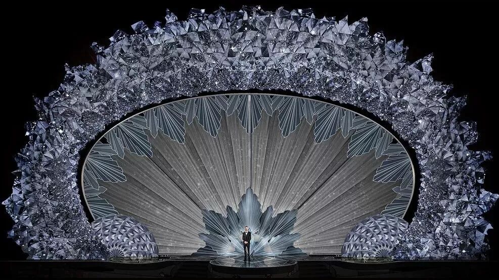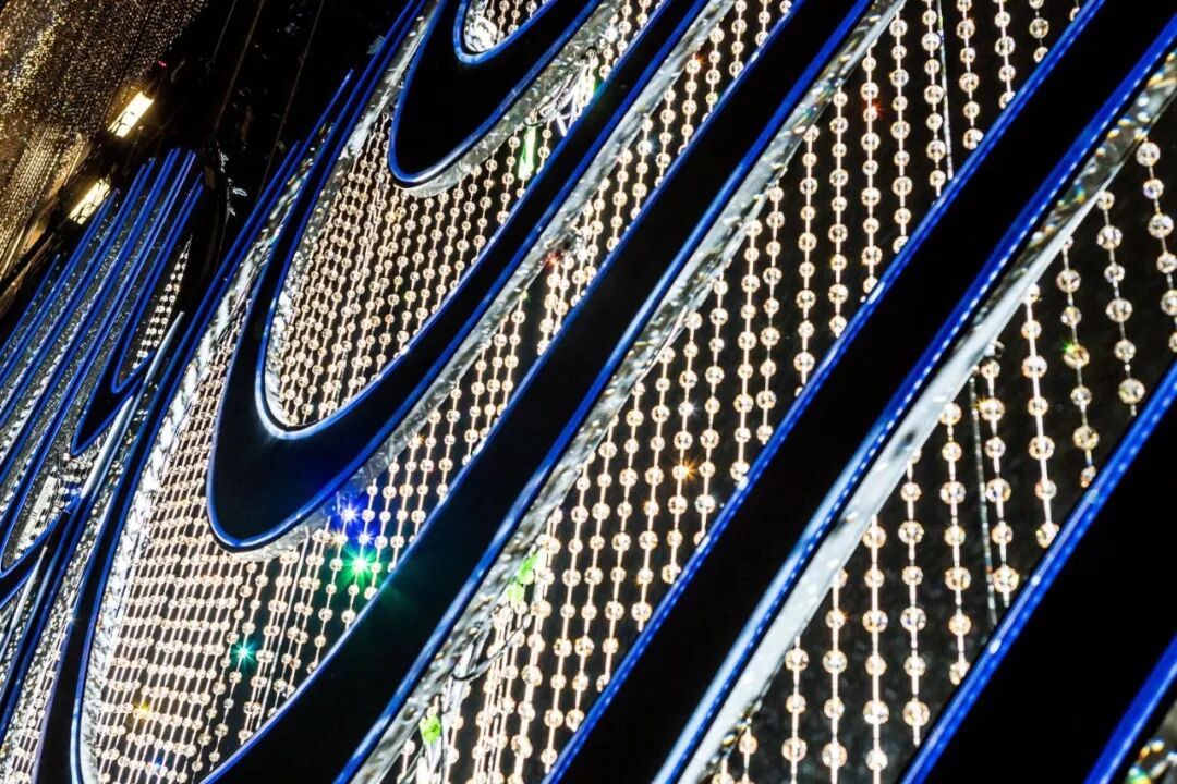 近看,在圆弧造型的曲线舞台中,搭配了上百名工匠精心打造的 9 万颗施华洛世奇水晶帷幕和艺术装置、两个浮动球体以及漩涡幕布设计,构成的一处美轮美奂的场景。
