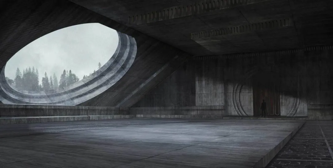 在开始草图创作之前,设计师参考了古老的金字塔遗迹、侵蚀山谷的冰川、大理石矿坑、西欧海岸的二战掩体等素材,最终将“粗野主义”作为影片建筑的整体基调。