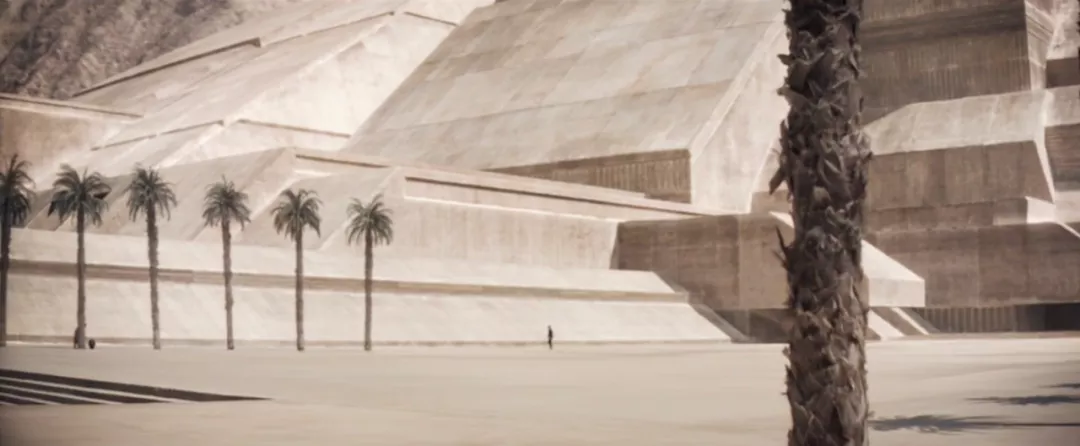 影片中的建筑规模庞大,冷酷粗犷,棱角分明,具有混凝土的质感,也体现着人们对力量的崇拜。