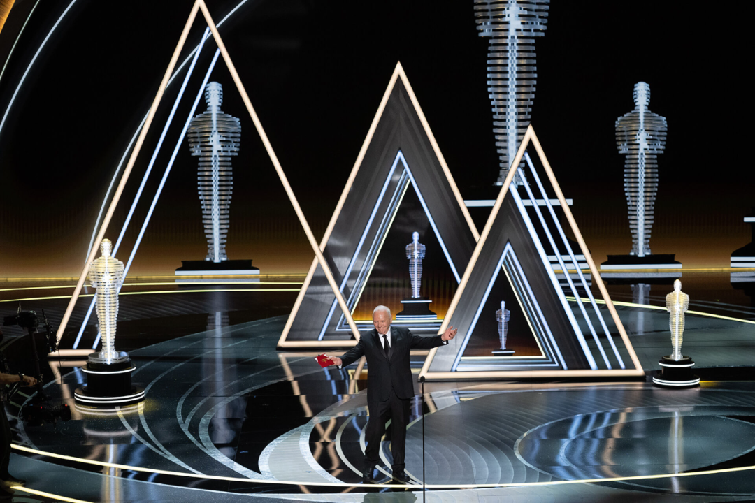 另外,制作设计师还将舞台向前延伸到前几排观众席,以营造一种身临其境的奇观,颂扬电影人的团结精神。