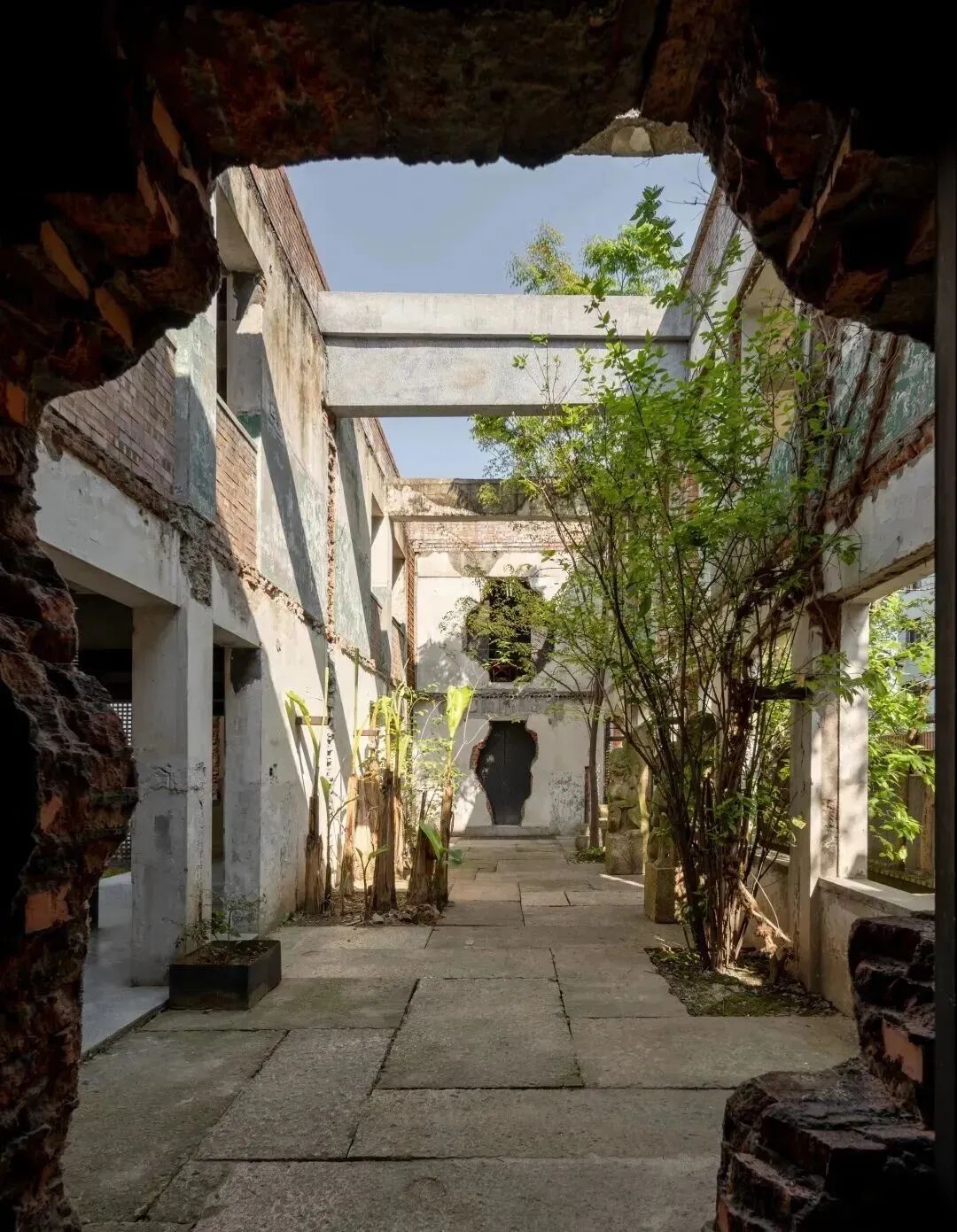 在改造过程中,相应变动了旧墟结构,做了一些必要的体量加减法一个普通现代主义风格的废墟被重新接纳到一个生长性的水系统。设计以此活体系统为本,组织功能体以及各种建构本体元素