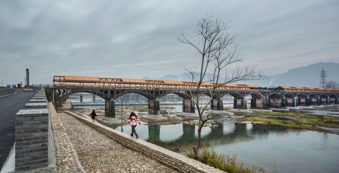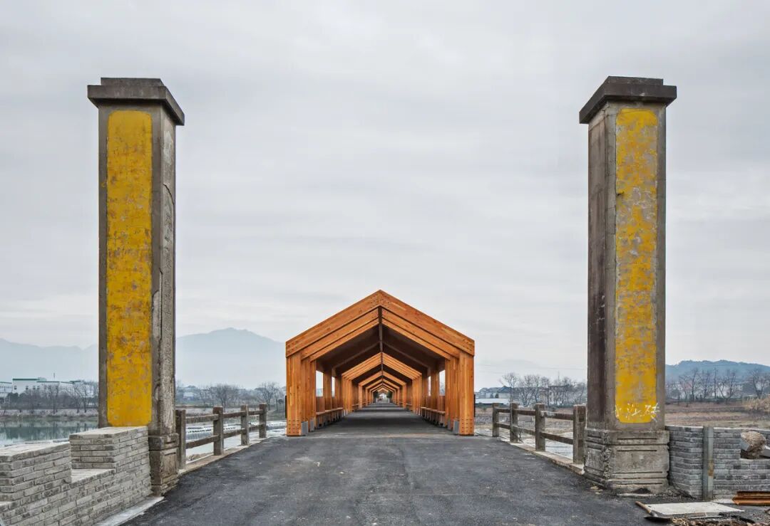 石门廊桥采用木装配结构外形借用当地建筑形态,和桥头的石门驿站以及村庄的民居形成连贯性。