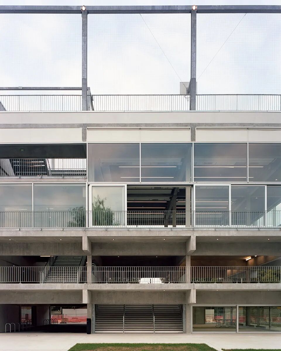 建筑中的不同活动空间垂直布置层层相叠,屋顶为运动场,供足球和篮球等运动使用。不同区域都有各自独立的入口,通过一座开放的楼梯井连接。