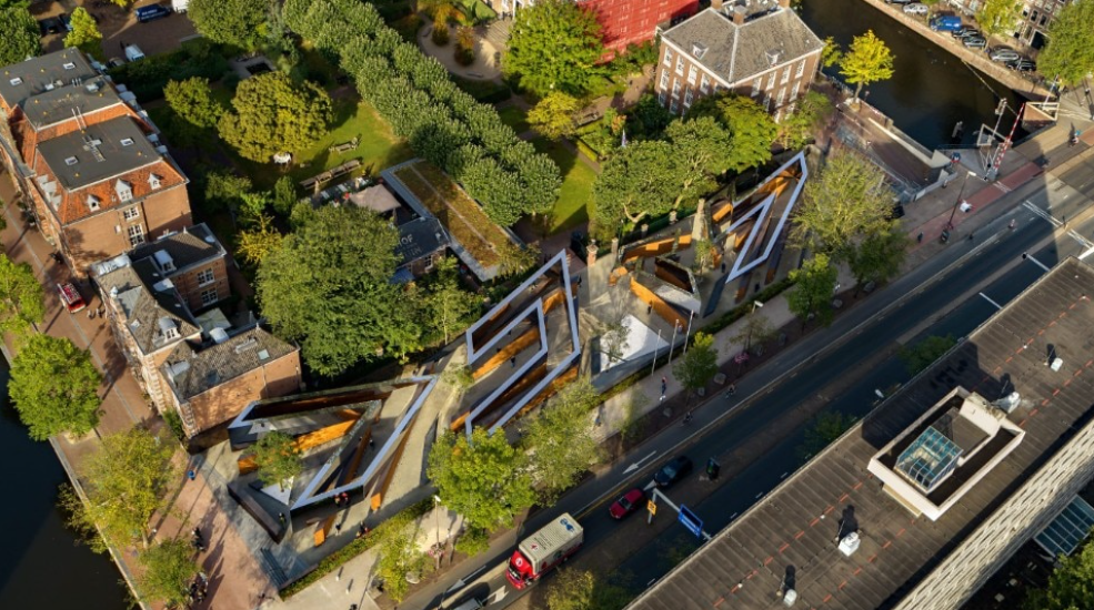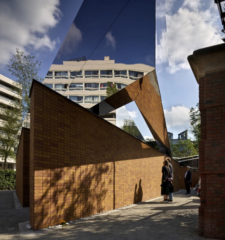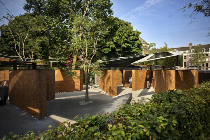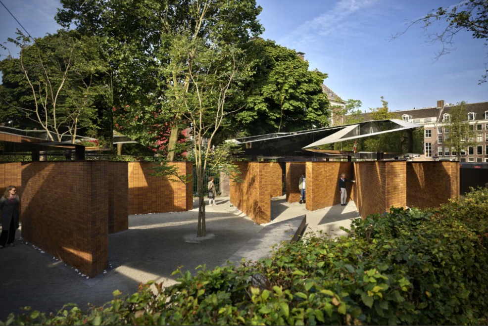 该纪念碑共1700平方米,包括四组体块,它们分别代表希伯来语רכזל中的四个字母,意为“纪念”。这些体块沿着主干道Weesperstraat的南北轴呈直线排列,西侧是Hoftuin展馆