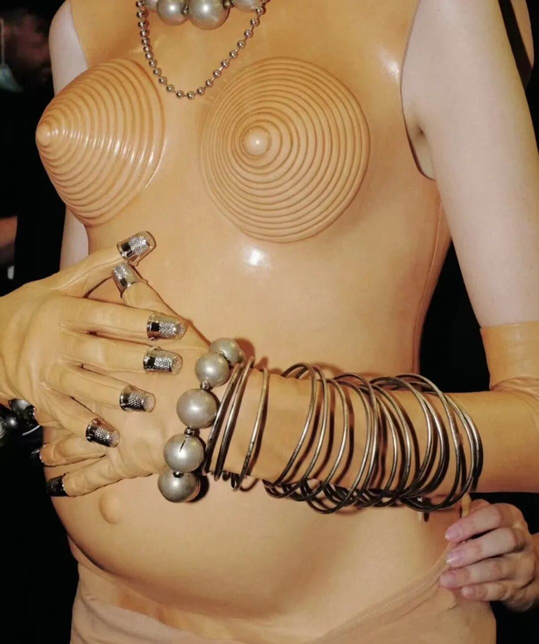 很多 Jean Paul Gaultier 的经典元素(宝藏Archives),香水瓶、露胸衣(改良版)、锥形胸罩,通过一种具像化的方式表达了对 Gaultier 工坊的敬意,插针包、卷尺、带顶针的指尖手套等都有被运用在服装上。