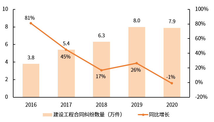 我们统计了这几年工程行业合同纠纷的数量,从2016年的3.8万件,到2020年的7.9万件,五年里翻番都不止,但是建筑业产值、企业数量、从业人员并没有翻番。