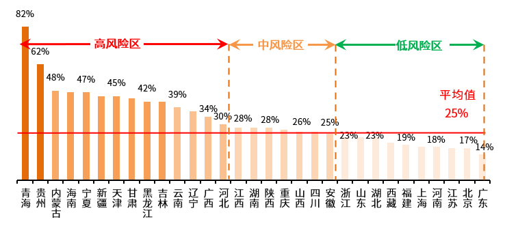 不同区域的地方债务又如何呢?我们梳理了2020年31个省市的地方债务负债率(如下图),这个比率是当地政府债务余额与GDP的比值,根据这个比率的高低分成低风险区、中风险区和高风险区。低风险区10个,负债率从14%到23%,他们要么是经济发达地区如北京、上海等,要么是转移支付比较多的地区如西藏;中风险地区7个,负债率从25%到28%,主要分布在中部地区;高风险地区14个,负债率从河北的30%到青海的82%。