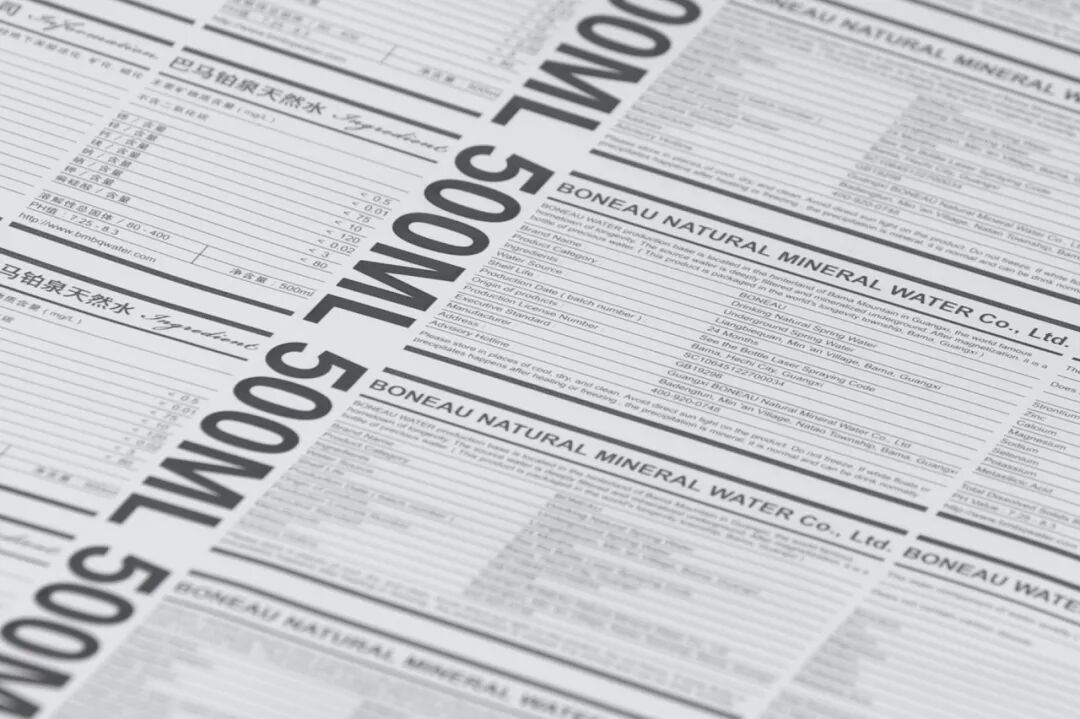 无标签瓶子放置营养成分和条形码,并将所有法律要求的信息压印在瓶身上,并在瓶盖上印上条形码。