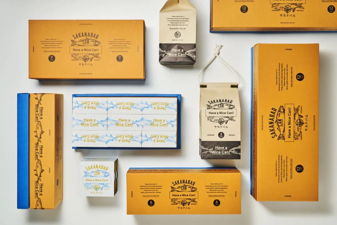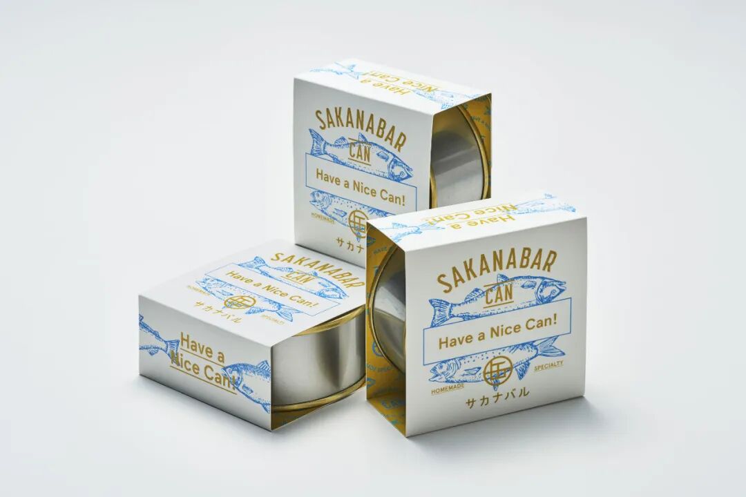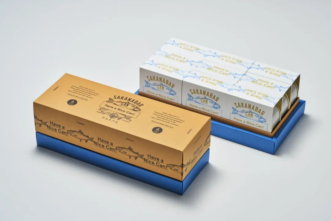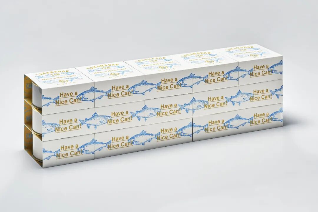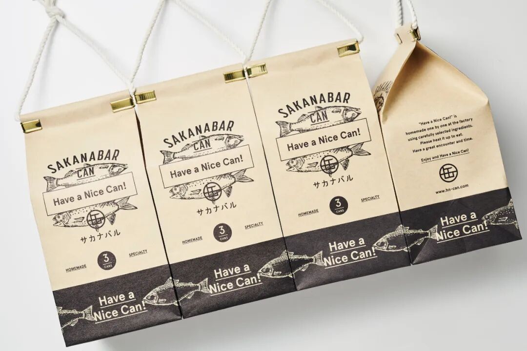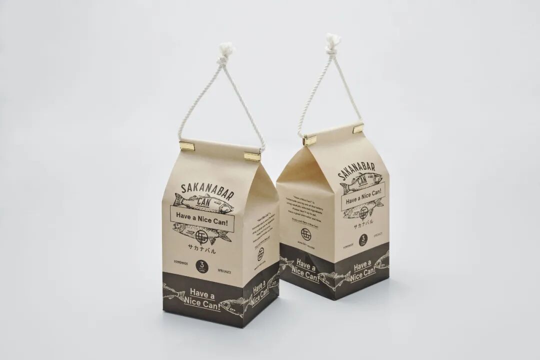 手工工艺罐装品牌的包装设计“祝你喝得愉快!”,这是日本海鲜餐厅创造的。礼品袋的把手使用类似渔港的绳子。礼品盒由亮橙色(太阳)和蓝色(海洋)组成。罐体没有装饰和标签,因此可以在家里或野营时直接加热使用。由于鱼的插图被放置在包装套的两侧,它们可以通过将它们并排排列而被无休止地连接起来,因此它们可以用作指向无垠大海的商店展示。