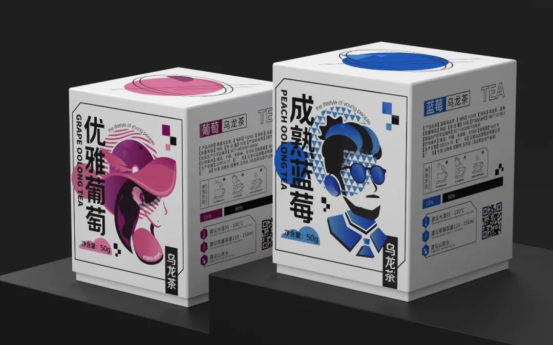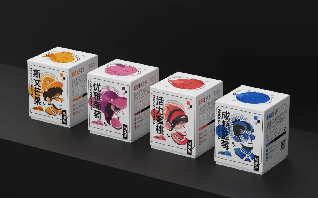 包装是在水果乌龙茶的基础上创造性地设计的,通过赋予芒果、葡萄、桃子和蓝莓口味的水果茶不同的个性,它代表了当今年轻人的多样化个性。利用碎片化的拼贴艺术的表现形式,希望现代年轻人能够利用碎片化的时间从繁忙的生活中放松下来,根据不同的心情搭配不同口味的茶,获得喝茶的美妙体验。