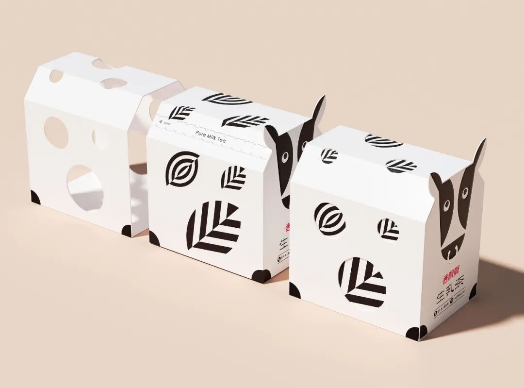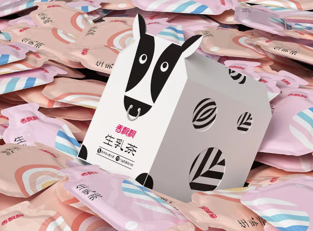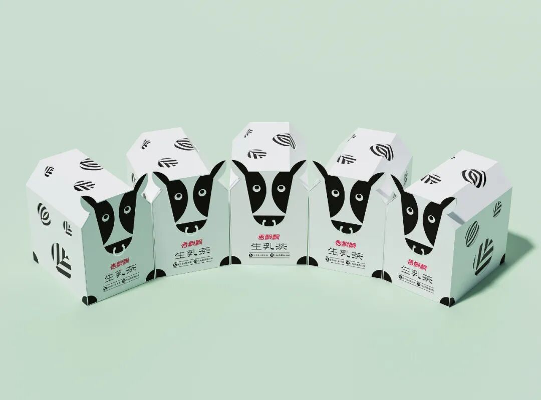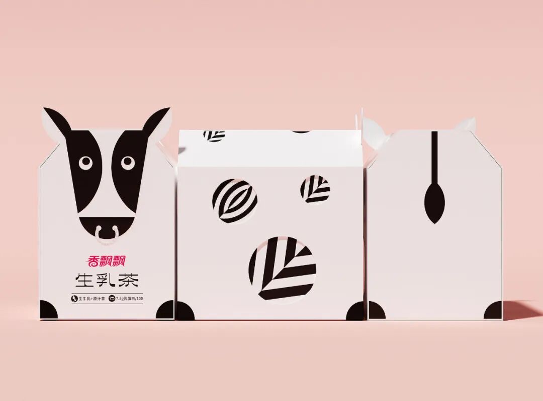 产品卖点是生奶+纯茶,所以包装设计是将茶和奶牛斑纹非常巧妙的结合在一起。打开盖子后,奶牛身上的斑纹是抽象的茶叶,传达了产品的卖点,原奶+纯茶。可爱的奶牛包装在货架上非常醒目,很容易吸引消费者的注意和购买。