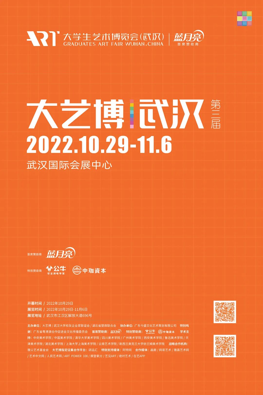 10月12日下午,大艺博组委会在官方媒体发布会上正式宣布:由大艺博、武汉大学校友企业家联谊会、湖北省楚商联合会共同主办的2022年第三届大学生艺术博览会(武汉)(简称:第三届武汉大艺博)将于10月29日-11月6日在武汉国际会展中心举办大艺博全新推出的首届火星潮流艺术节亦将于11月4日-11月6日同场举办。秉持推动中国青年创新力量成长及助力武汉城市文化建设的两大初衷,中国洗涤行业标杆品牌蓝月亮成为本届大艺博的首席赞助商;中国民用电工行业龙头企业公牛集团、中国知名投资机构中珈资本成为本届大艺博的特别赞助商。