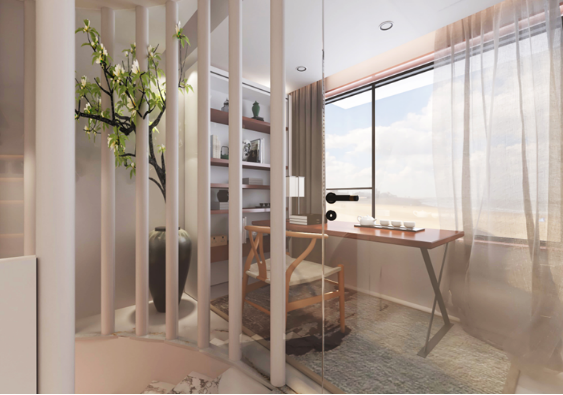 书画室的设计采取了新中式风格,古典文化的韵味在传统元素和现代元素相互渗透、相互融合的家居空间里氤氲着,让人不禁想倚着窗户,小品一杯红酒,看一会书,又或者看看窗外的美景,尽情享受天人合一的散漫时光。