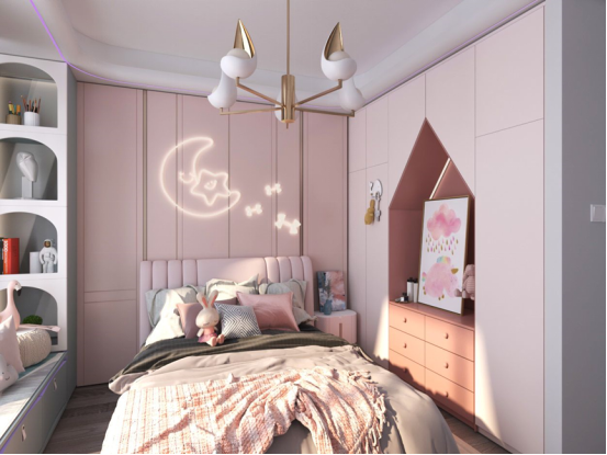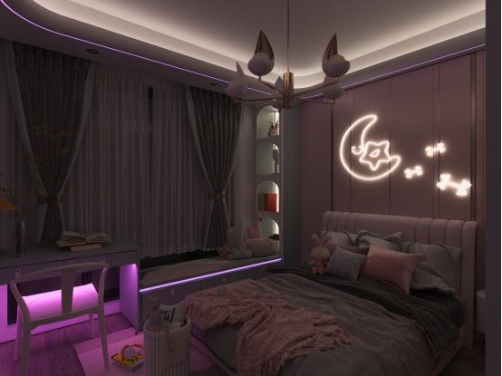 女孩房的布置以大多数女孩无法抗拒的粉色为基调,并且在这个背景色之上,增加了一些性化的装饰、家居,比如月亮灯和紫色的边灯、小房子轮廓的抽屉,用强烈的反差效果打造出一种梦幻的少女感。
