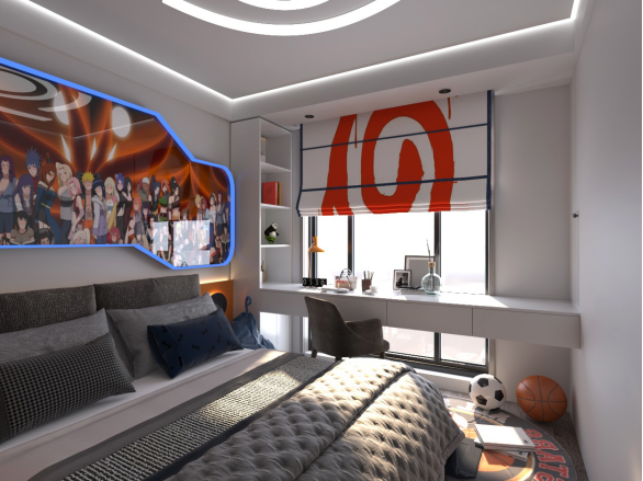 男孩房也结合了居者对于动漫《火影忍者》的喜爱,以火影忍者挂画的橙色为主色调,房间也选用了白橙相间的颜色,挂画相得益彰。同时男孩房和女孩房之间的连体书桌巧妙的预留了一个可会面的隐藏小柜,两人作业之余,可以打开墙体上隐藏的柜门,聊尽今天的趣闻趣事。