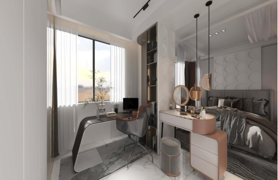 对于主卧,着重强调的是居者与空间、物品的关系及其所蕴含的意义和情绪。主卧整体采用统一的色调,白色薄纱与黑色地毯和轻奢压制的主卧大床相配,十分具有质感;浴室以一层白色薄纱消除与主卧的边界;办公区与化妆区正对着主卧大床,让居者在早上起床与夜晚办公时都能够得到便利。
