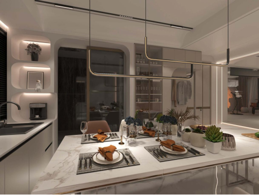 餐厨与客厅一体相连,该设计扩大了视觉空间,同时便于家人间互动,增进彼此交流与沟通。小到绿植的摆置搭配,大至分区放置物品的考究,都彰显着每位家庭成员热爱生活的气质。华丽的金属吊灯如跃动的音符,一曲爱与美食的家庭乐章就这样欣然奏响,绵逸柔远。