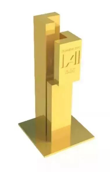 IAI奖座以金、银两色为主,造型语言简约独特,主体结构由三个不同大小尺度的直角块面镶嵌而成,形似一自由落体建筑,有机融合了中国传统建筑的“榫卯”结构,彼此相互抱合、递层上升,诠释了IAI从原来单一的室内奖逐步扩展为建筑设计、工业设计等全域设计大奖的成长轨迹,体现了IAI与“天人合一”、“一生二,二生三,三生万物”道家哲学思想精髓的高度契合,寓意着IAI诞生的不凡,充分展现了IAI庄重、正大、包容、开放且勇于不断超越自我的生命特质和未来发展的无限可能性,同时,向外传递了IAI设计奖严谨、公平、公正的核心价值观,秉持传统文化与时代创新相融合的可持续发展理念。