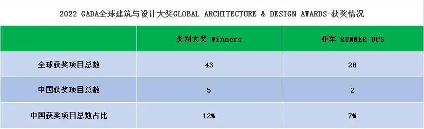 本期全球设计奖项研究所为大家整理了2022 GADA全球建筑与设计大奖 GLOBAL ARCHITECTURE & DESIGN AWARDS 获奖名单。据统计,本届共有71个项目获奖(类别大奖43个,亚军28个),其中中国项目7个(类别大奖5个,亚军2个) ,占比10%。此次共有四家中国设计团队上榜,分别是瓴柏国际设计顾问有限公司、橙田建筑室研所、伍伟廷建筑师事务所、(深圳)RMJM建筑设计事务所。恭喜!