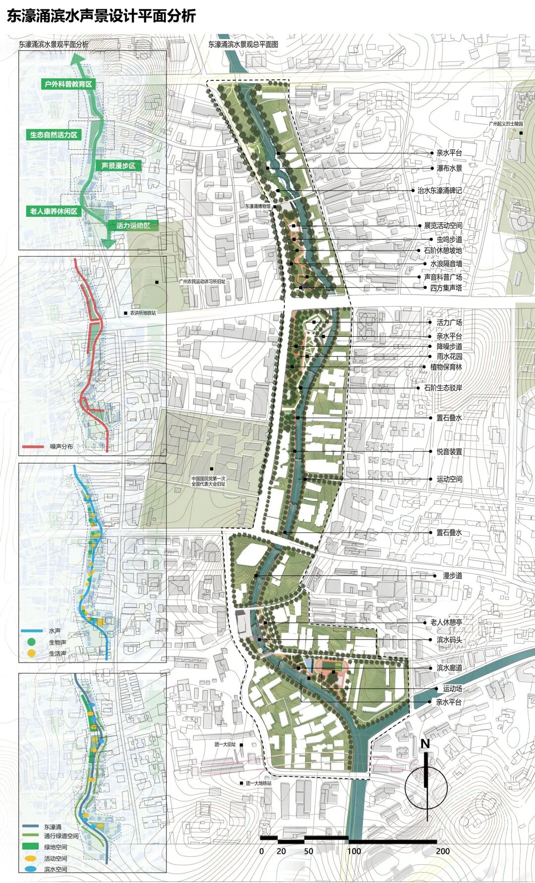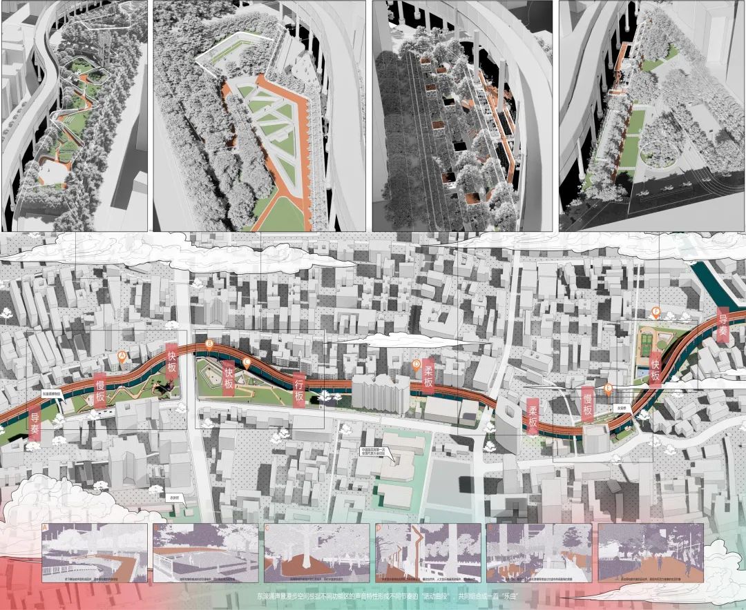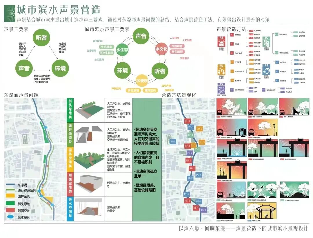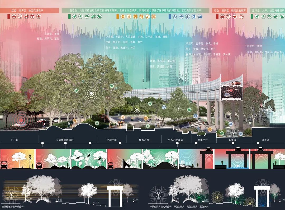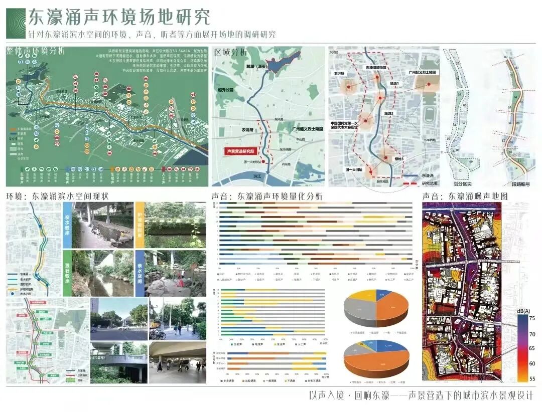 创作说明:针对广州东濠涌沿线环境,在声景理论指导下,运用声景地图、调查模型和感知评价等手段,以声景三要素为线索,深入分析东濠涌滨水景观的声音、空间环境、人的使用现状和问题,并进行具有针对性的声景观综合提升设计。