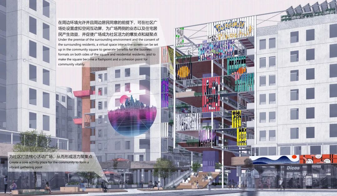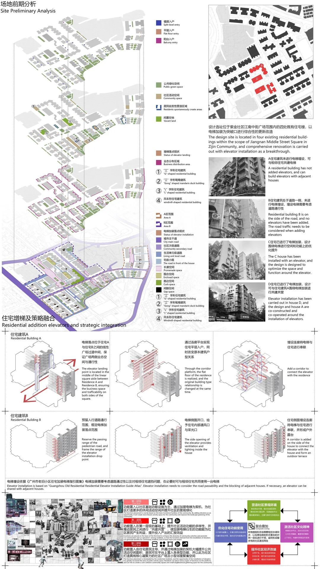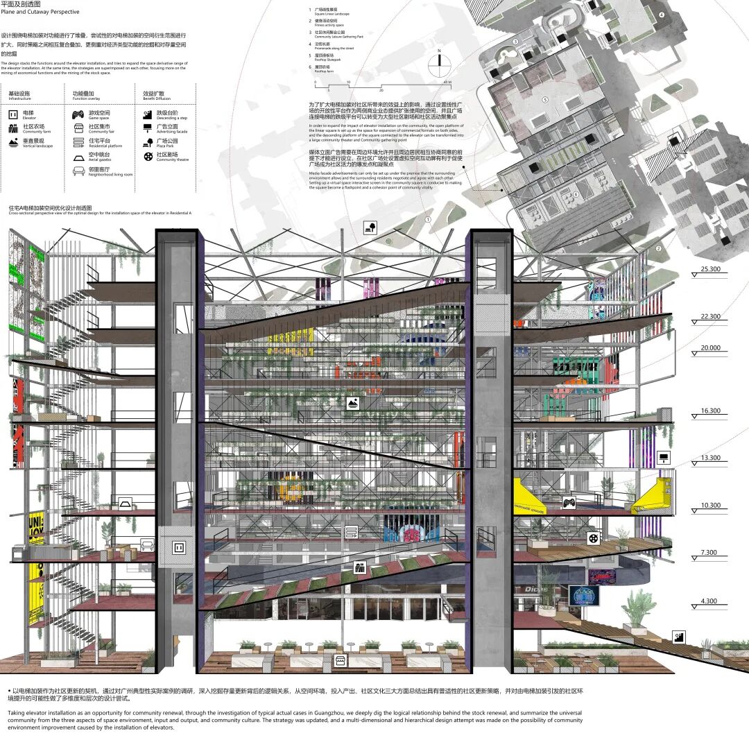 创作说明:以电梯加装作为社区更新的契机,通过对广州实际案例的调研,挖掘存量更新背后的逻辑关系,从空间环境、投入产出、社区文化三大方面总结出策略,对由电梯加装引发的社区环境提升的可能性做了多维度和多层次的设计尝试。