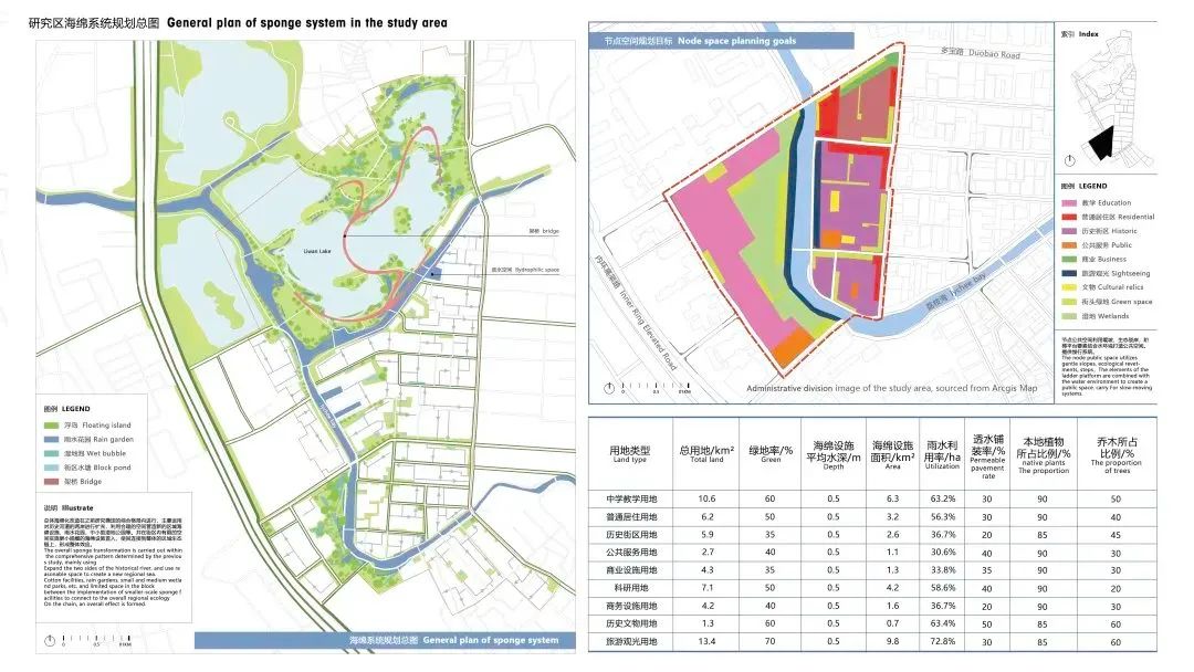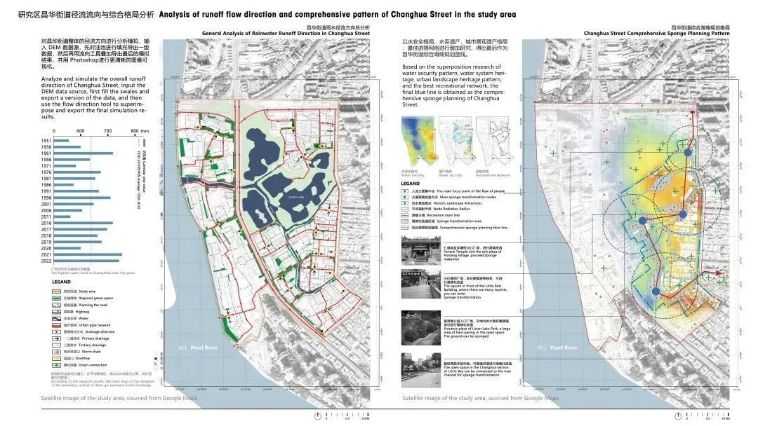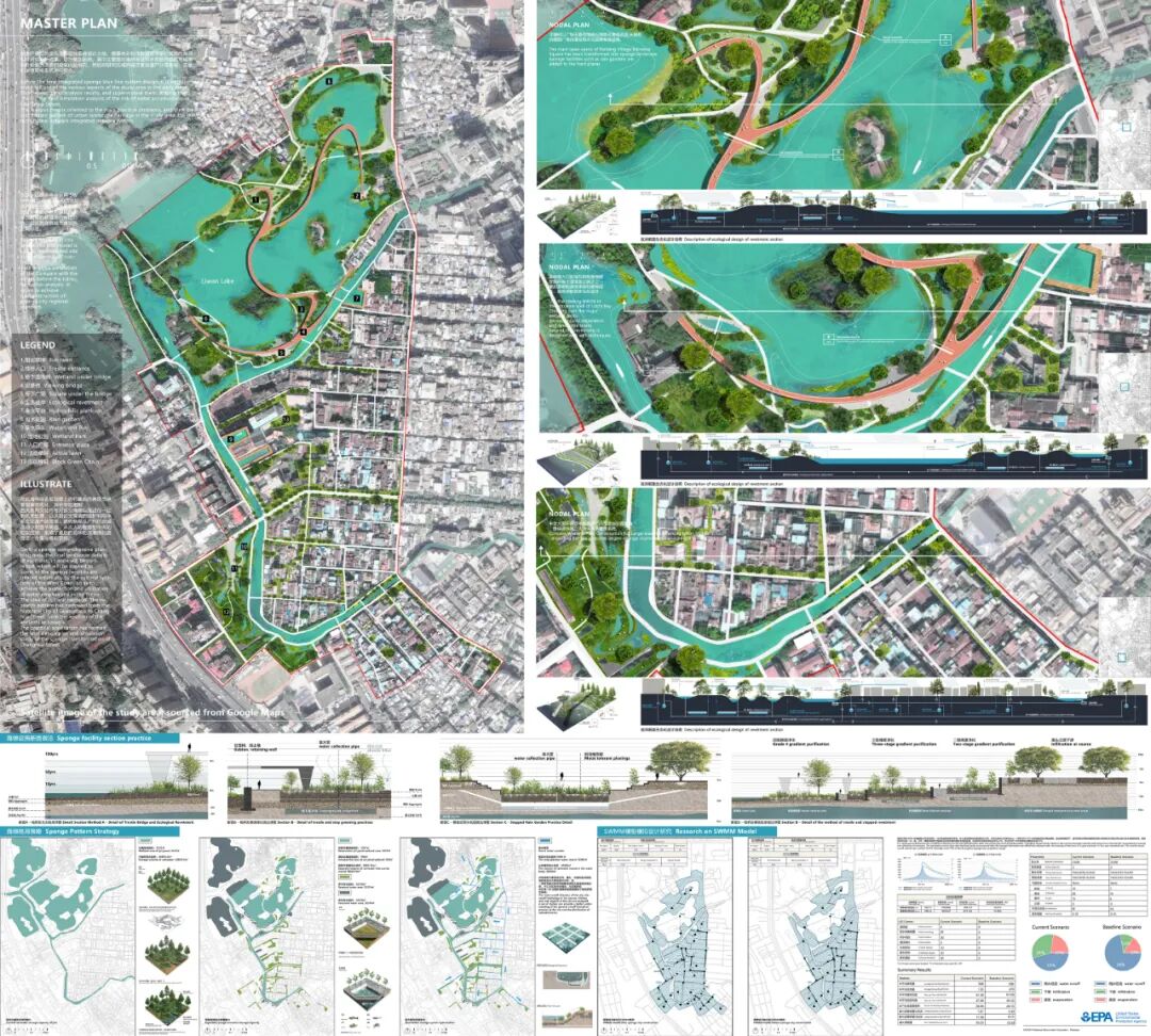 创作说明:本设计运用海绵城市理论在历史城区内的指导作用,运用SWMM模型、景观格局等手段,分析昌华街道雨水管理现状和问题,在水安全、遗产分布和游憩路线叠加形成综合海绵格局蓝线,并在此蓝线内进行整体海绵化改造提升设计。