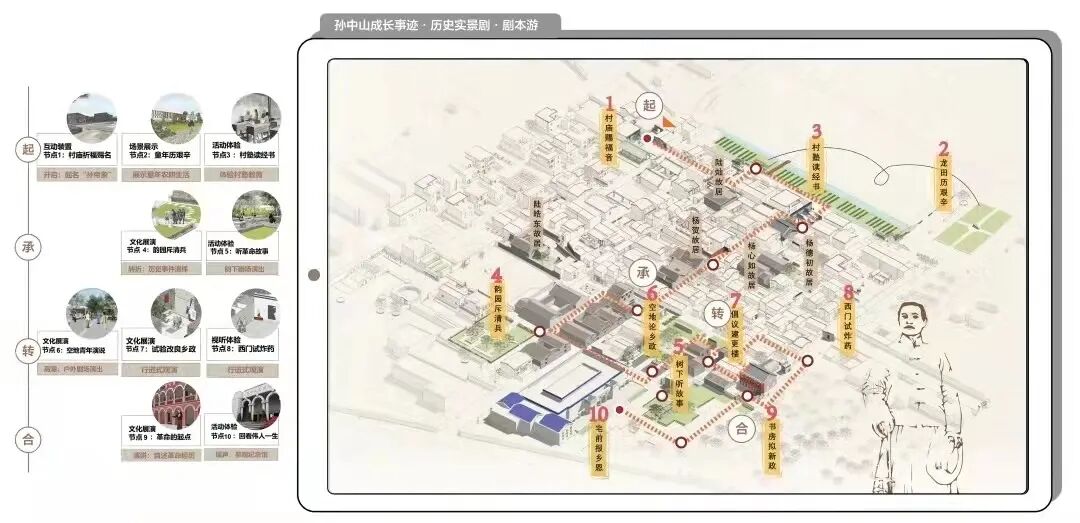 创作说明:作品运用关联耦合理论,结合文化遗产展示理念,将孙中山故里翠亨村的建筑遗存与地方文化、时代印记及伟人成长历史联系起来,提出了系统性的展示空间规划,应用多维度和多层次的展示方式,让文化遗产可感知、可体验、可传递。