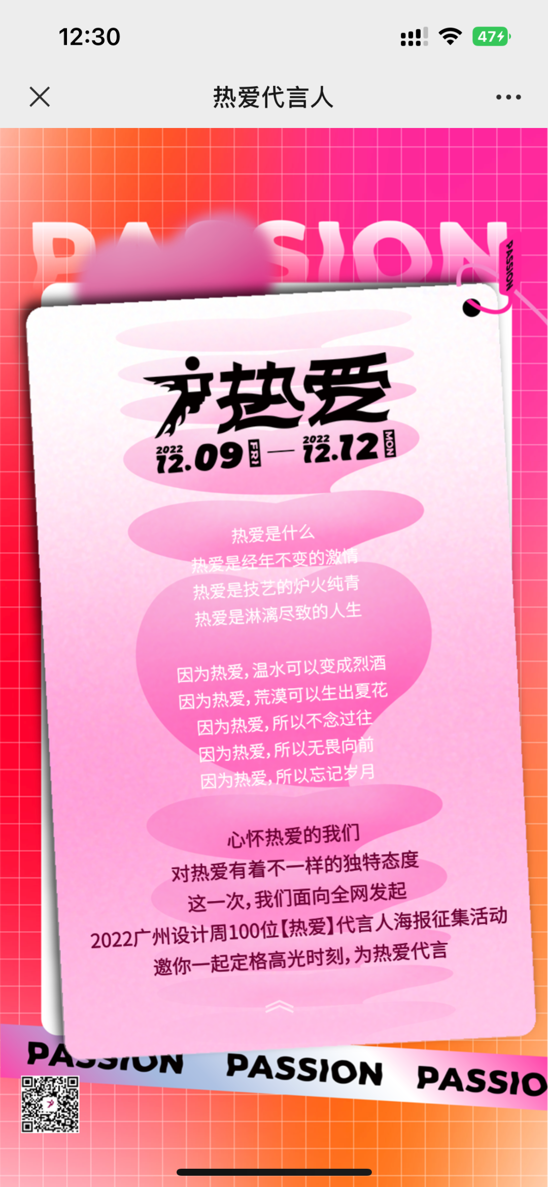 *组委会将从征集的2022广州设计周青春代言人海报中优选100位作为官方认证2022广州设计周【热爱】代言人,同时在广州设计周官方公众号进行公布展示。